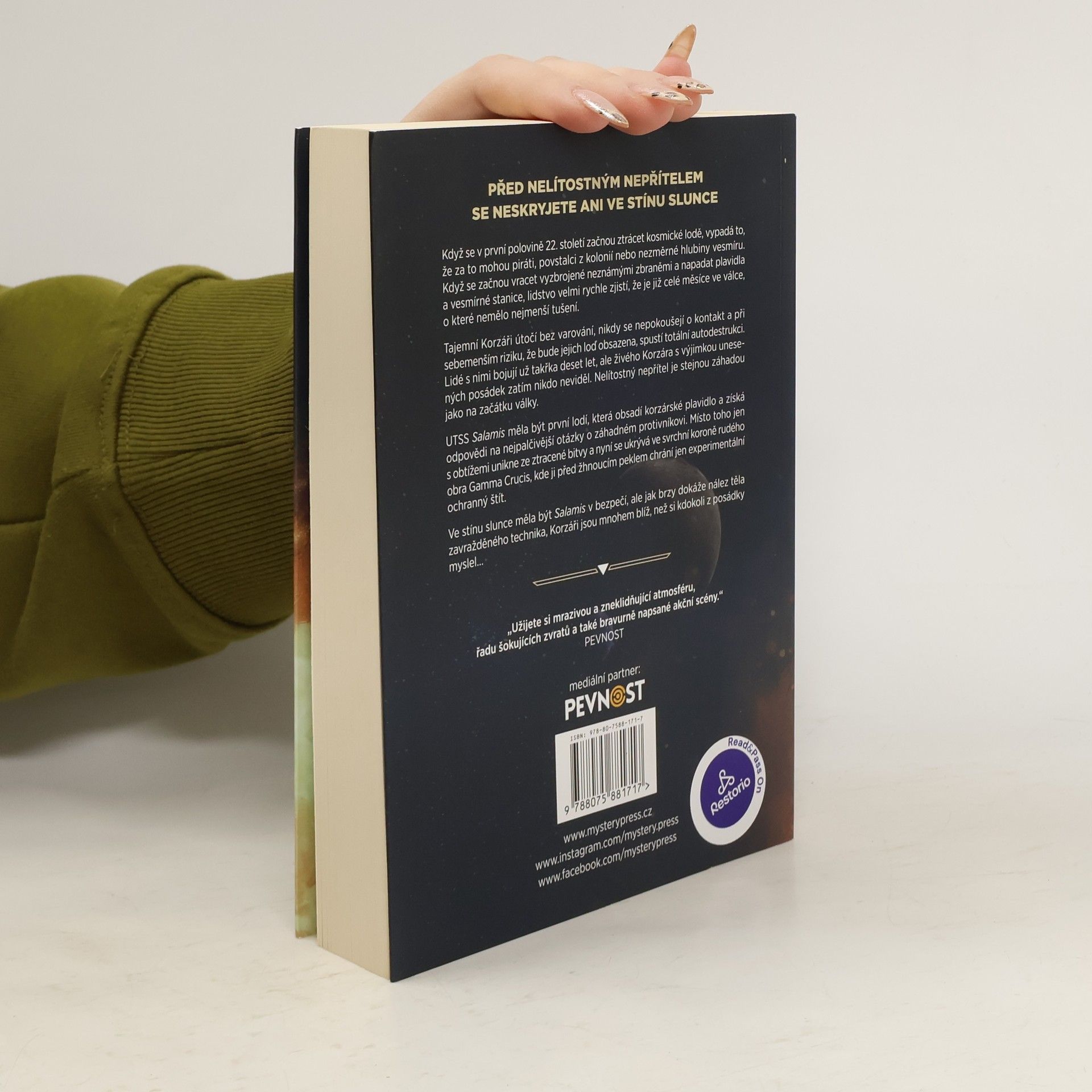 PŘED NELÍTOSTNÝM NEPŘÍTELEM SE NESKRYJETE ANI VE STÍNU SLUNCE Když se v první polovině 22. století začnou ztrácet kosmické lodě, vypadá to, že za to mohou piráti, povstalci z kolonií nebo nezměrné hlubiny vesmíru. Když se začnou vracet vyzbrojené neznámými zbraněmi a napadat plavidla a vesmírné stanice, lidstvo velmi rychle zjistí, že je již celé měsíce ve válce, o které nemělo nejmenší tušení. Tajemní Korzáři útočí bez varování, nikdy se nepokoušejí o kontakt a při sebemenším riziku, že bude jejich loď obsazena, spustí totální autodestrukci. Lidé s nimi bojují už takřka deset let, ale živého Korzára s výjimkou unesených posádek zatím nikdo neviděl. Nelítostný nepřítel je stejnou záhadou jako na začátku války. UTSS Salamis měla být první lodí, která obsadí korzárské plavidlo a získá odpovědi na nejpalčivější otázky o záhadném protivníkovi. Místo toho jen s obtížemi unikne ze ztracené bitvy a nyní se ukrývá ve svrchní koroně rudého obra Gamma Crucis, kde ji před žhnoucím peklem chrání jen experimentální ochranný štít. Ve stínu slunce měla být Salamis v bezpečí, ale jak brzy dokáže nález těla zavražděného technika, Korzáři jsou mnohem blíž, než si kdokoli z posádky myslel… _________________ „Užijete si mrazivou a zneklidňující atmosféru, řadu šokujících zvratů a také bravurně napsané akční scény.“ – PEVNOST