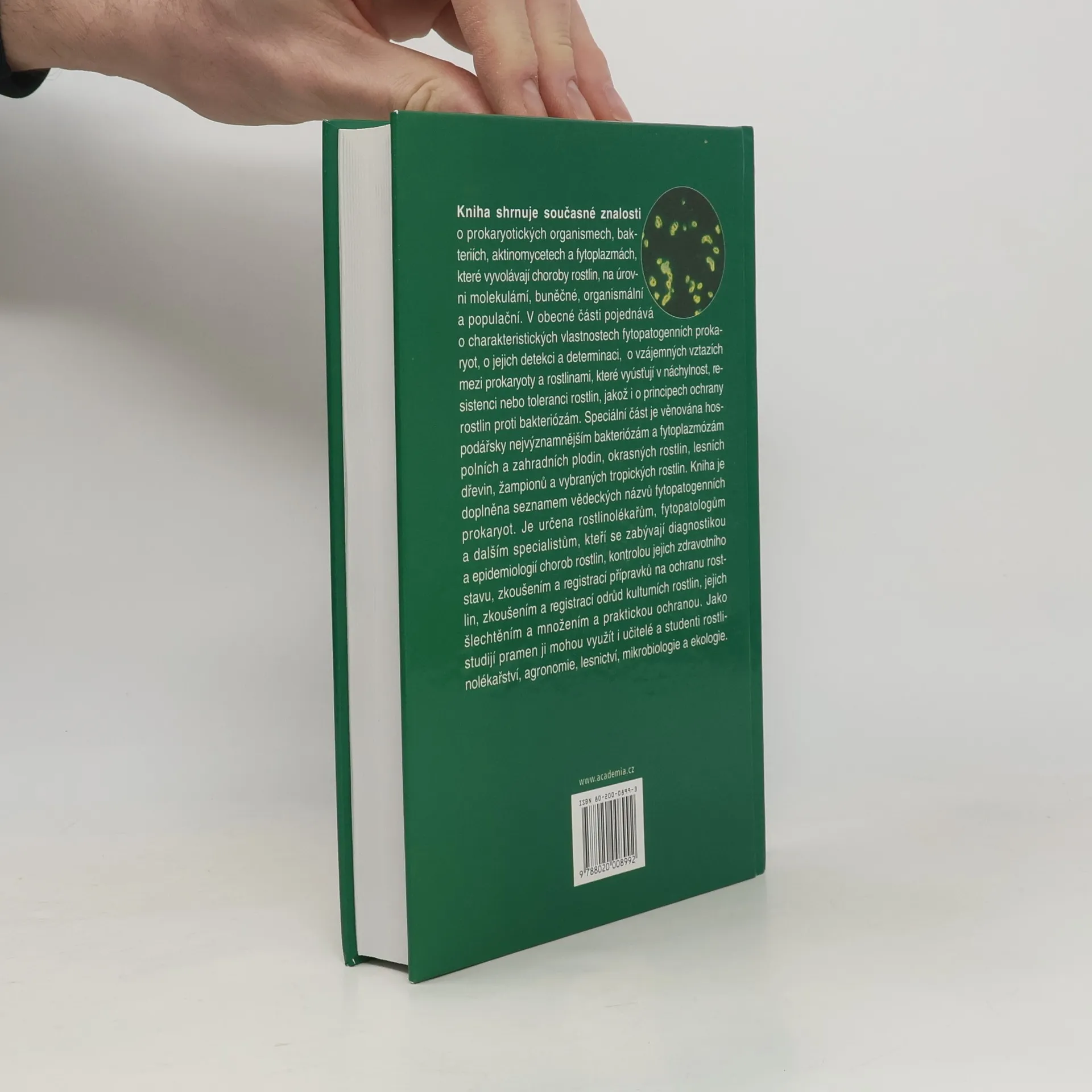Kniha shrnuje současné znalosti o prokaryotických organismech, bakteriích, aktinomycetech a fytoplazmách, které vyvolávají choroby rostlin, na úrovni molekulární, buněčné, organismální a populační. V obecné části pojednává o charakteristických vlastnostech fytopatogenních prokaryot, o jejich detekci a determinaci, o vzájemných vztazích mezi prokaryoty a rostlinami, které vyúsťují v náchylnost, resistenci nebo toleranci rostlin, jakož i o principech ochrany rostlin proti bakteriózám. Speciální část je věnována hospodářsky nejvýznamnějším bakteriózám a fytoplazmózám polních a zahradních plodin, okrasných rostlin, lesních dřevin, žampionů a vybraných tropických rostlin. Kniha je doplněna seznamem vědeckých názvů fytopatogenních prokaryot. Je určena rostlinolékařům, fytopatologům a dalším specialistům, kteří se zabývají diagnostikou a epidemiologií chorob rostlin, kontrolou jejich zdravotního stavu, zkoušením a registrací odrůd kulturních rostlin, jejich šlechtěním a množením a praktickou ochranou. Jako studijní pramen ji mohou využít i učitelé a studenti rostlinolékařství, agronomie, lesnictví, mikrobiologie a ekologie.