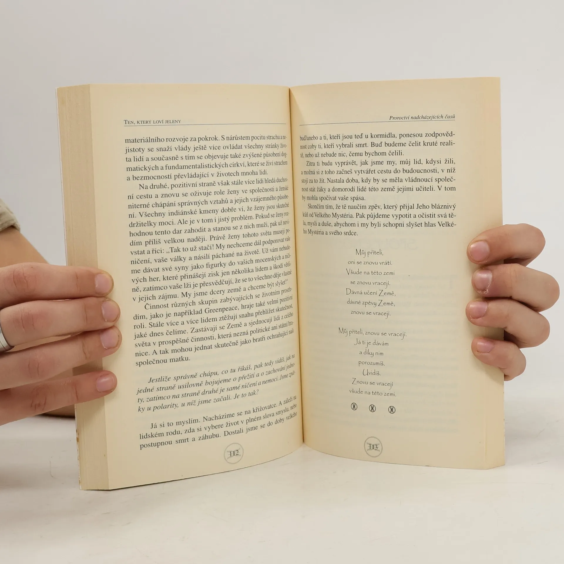 Mnoho čtenářů si po přečtení této knihy uvědomí, že náš evropský pohled na americké Indiány je velmi zkreslený a postrádá reálná fakta. Kniha je nesmírně působivé svědectví o původním životě domorodého lidu tohoto kontinentu, o příchodu "bílého muže" a o střetu dvou kultur, jenž stál Indiány nejen ztrátu půdy, ale především ztrátu národní identity, kultury a duchovních hodnot. Fakta, která autor knihy Kurt Kaltredier předkládá zajímavou formou rozhovorů mezi mladým bělochem Johnem a 118 let starým Indiánem jménem Ten, který honí jeleny, jsou doslova šokující, protože vycházejí z dobových záznamů a ukazují krutost, s níž byli Indiáni vyvražďováni, přesidlováni do rezervací a násilně nuceni přijmout evropský způsob života i náboženství. Indiánská dávná proroctví jasně říkají, že pokud člověk znovu nenajde vztah k Matce Zemi a ke skutečným duchovním hodnotám, dojde k Velké očistě, která postihne celou naši planetu. A času už není nazbyt!