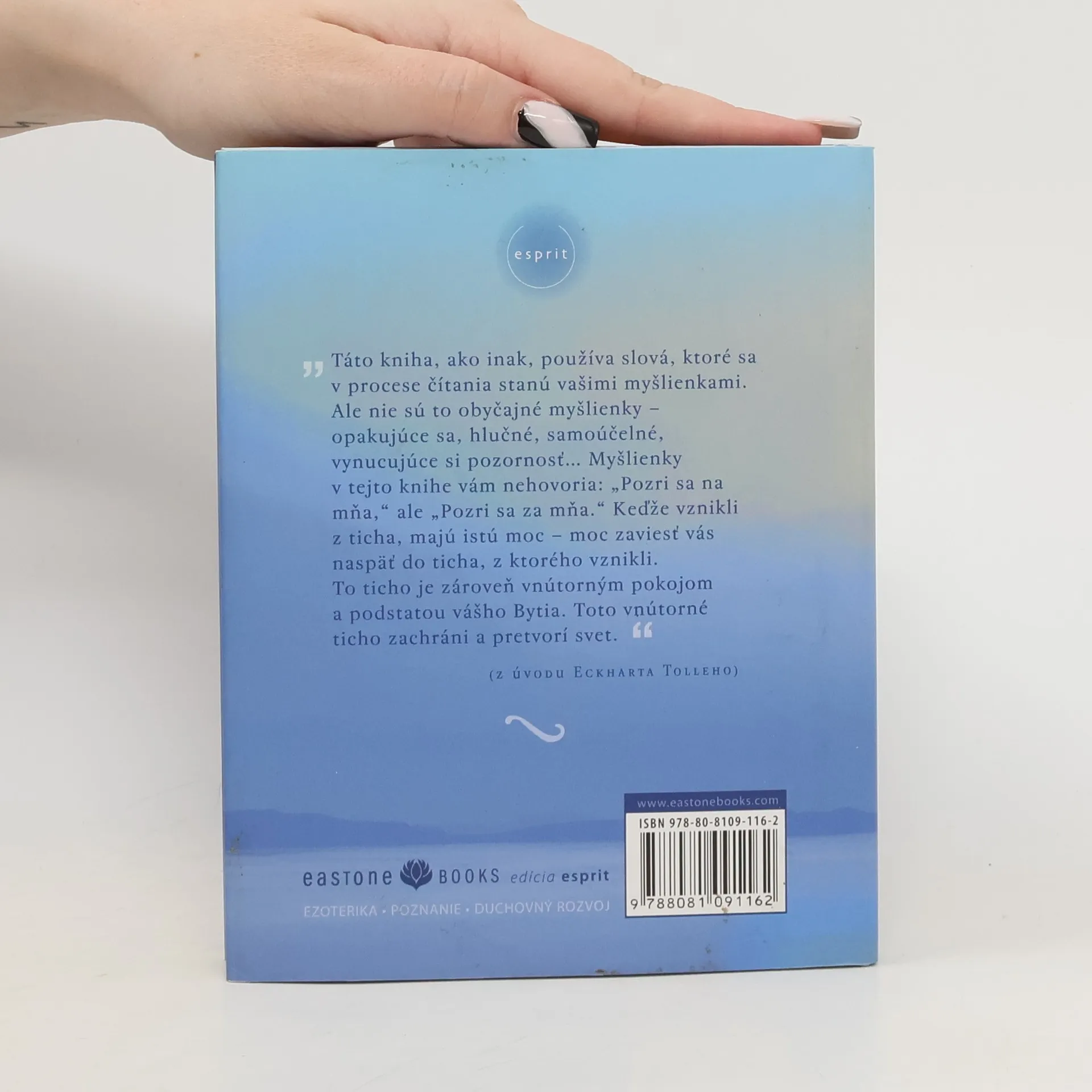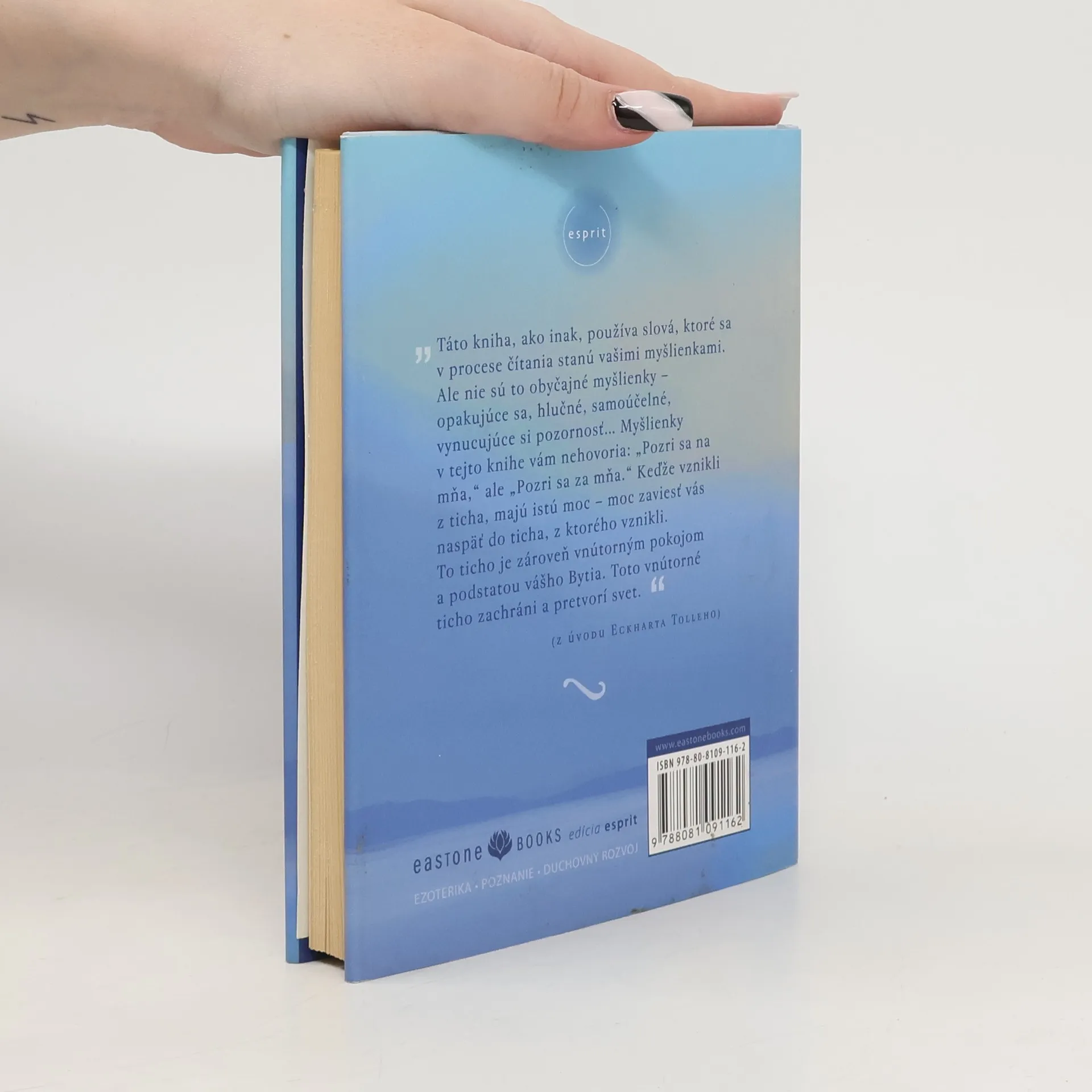 Ponorte sa do ticha. Podstata učenia Eckharta Tolleho je jednoduchá: Ak sa napojíme na vnútorné ticho, dostaneme sa za hranice našej mysle a emócií a objavíme tak hlboký trvalý pokoj, spokojnosť a vyrovnanosť. Jeho mimoriadne úspešná prvá kniha s názvom Sila prítomného okamihu oslovila milióny ľudí na celom svete. V tomto netrpezlivo očakávanom novom diele Tolle ponúka podstatu svojho učenia v krátkych jednoduchých textoch, zrozumiteľných pre každého. Eckhart Tolle dobre rozumie duchovným potrebám dnešnej doby. Vychádza z podstaty všetkých duchovných tradícií a ich pravdy vyjadruje prekvapivým a osviežujúcim spôsobom. Výsledkom je kniha, ktorá je paradoxne starobylá a súčasná zároveň, plná dobre načasovaných a silných posolstiev. Reč ticha sa môže stať prinajmenšom prebudením pre tých čitateľov, ktorí dokážu dať slovám šancu, aby na nich zapôsobili svojim tichým kúzlom.