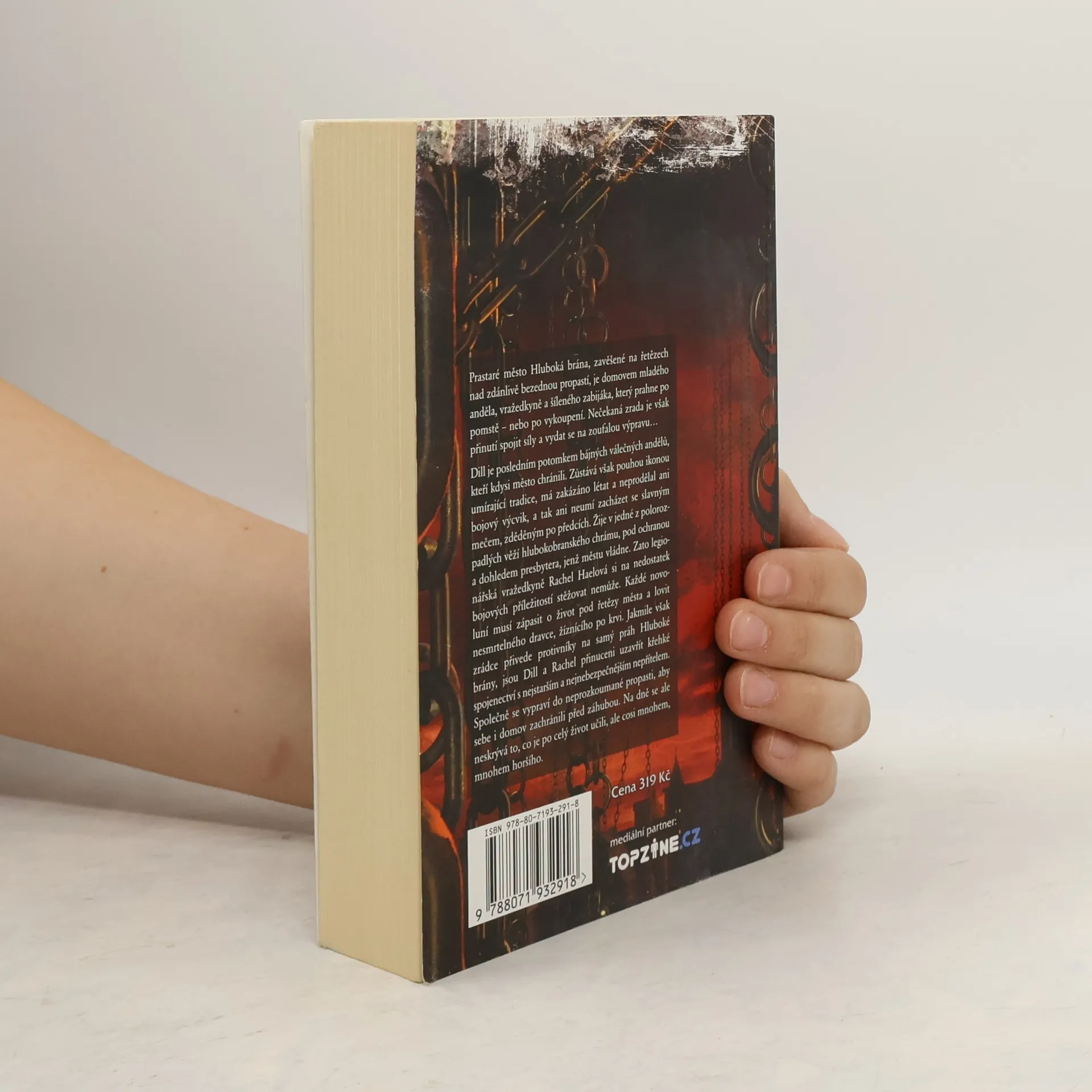 Prastaré město Hluboká brána, zavěšené na řetězech nad zdánlivě bezednou propastí, je domovem mladého anděla, vražedkyně a šíleného zabijáka, který prahne po pomstě – nebo po vykoupení. Nečekaná zrada je však přinutí spojit síly a vydat se na zoufalou výpravu… Dill je posledním potomkem bájných válečných andělů, kteří kdysi město chránili. Zůstává však pouhou ikonou umírající tradice, má zakázáno létat a neprodělal ani bojový výcvik, a tak ani neumí zacházet se slavným mečem, zděděným po předcích. Žije v jedné z polorozpadlých věží hlubokobranského chrámu, pod ochranou a dohledem presbytera, jenž městu vládne. Zato legionářská vražedkyně Rachel Haelová si na nedostatek bojových příležitostí stěžovat nemůže. Každé novoluní musí zápasit o život pod řetězy města a lovit nesmrtelného dravce, žíznícího po krvi. Jakmile však zrádce přivede protivníky na samý práh Hluboké brány, jsou Dill a Rachel přinuceni uzavřít křehké spojenectví s nejstarším a nejnebezpečnějším nepřítelem. Společně se vypraví dolů do neprozkoumané propasti, aby sebe i domov zachránili před záhubou. Na dně se ale neskrývá to, co je po celý život učili, ale cosi mnohem, mnohem horšího… Přeložili David Záleský a Markéta Záleská.