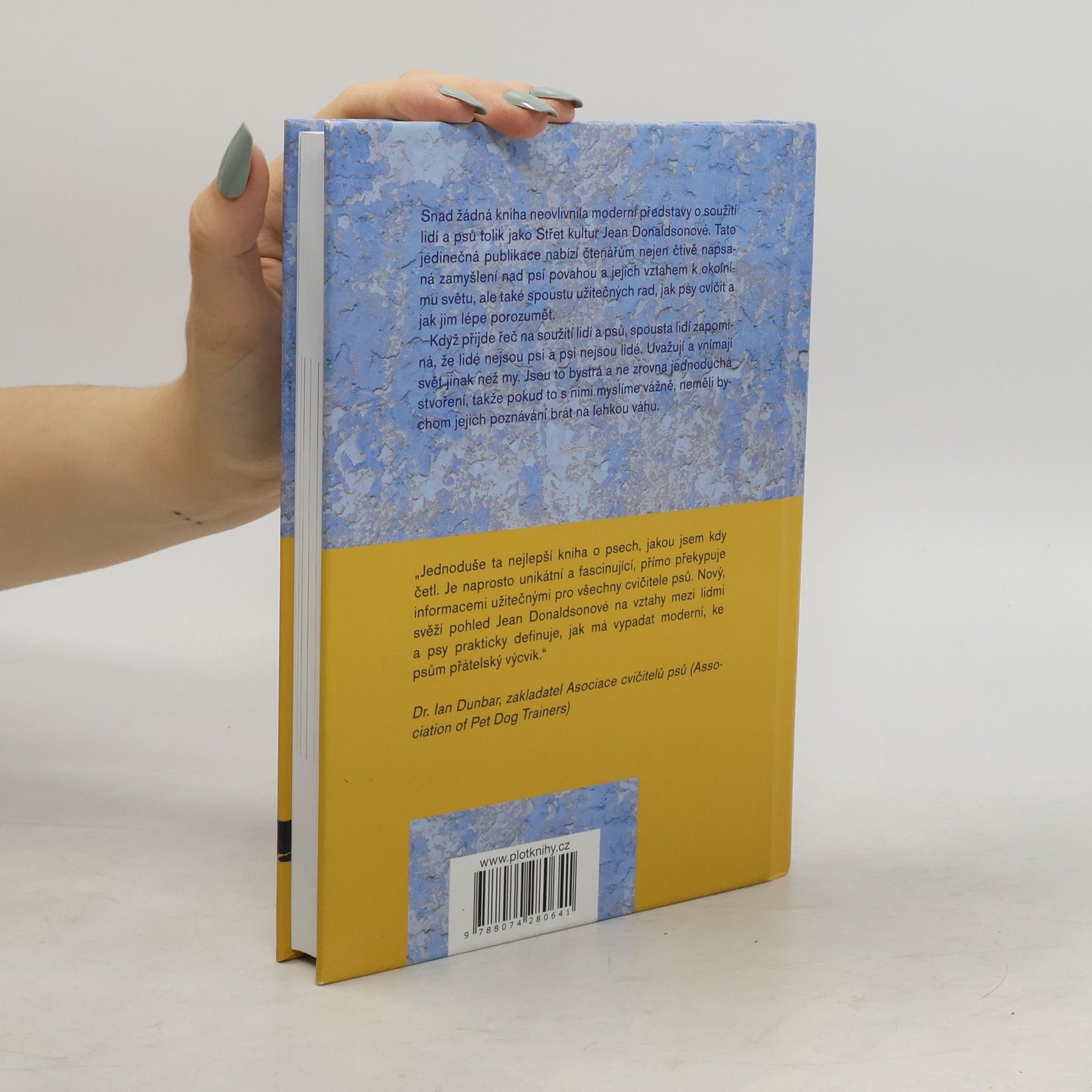 Snad žádná kniha neovlivnila moderní představy o soužití lidí a psů tolik jako kniha Střet kultur Jean Donaldsonové. Tato jedinečná publikace nabízí čtenářům nejen čtivě napsaná zamyšlení nad psí povahou a jejich vztahem k okolnímu světu, ale také spoustu užitečných rad, jak psy cvičit a jak jim lépe porozumět. Přijde-li řeč na soužití lidí a psů, spousta lidí zapomíná, že lidé nejsou psi a psi nejsou lidé. Uvažují a vnímají svět jinak než my. Jsou to bystrá a ne zrovna jednoduchá stvoření, takže pokud to s nimi myslíme vážně, neměli bychom jejich poznávání brát na lehkou váhu.