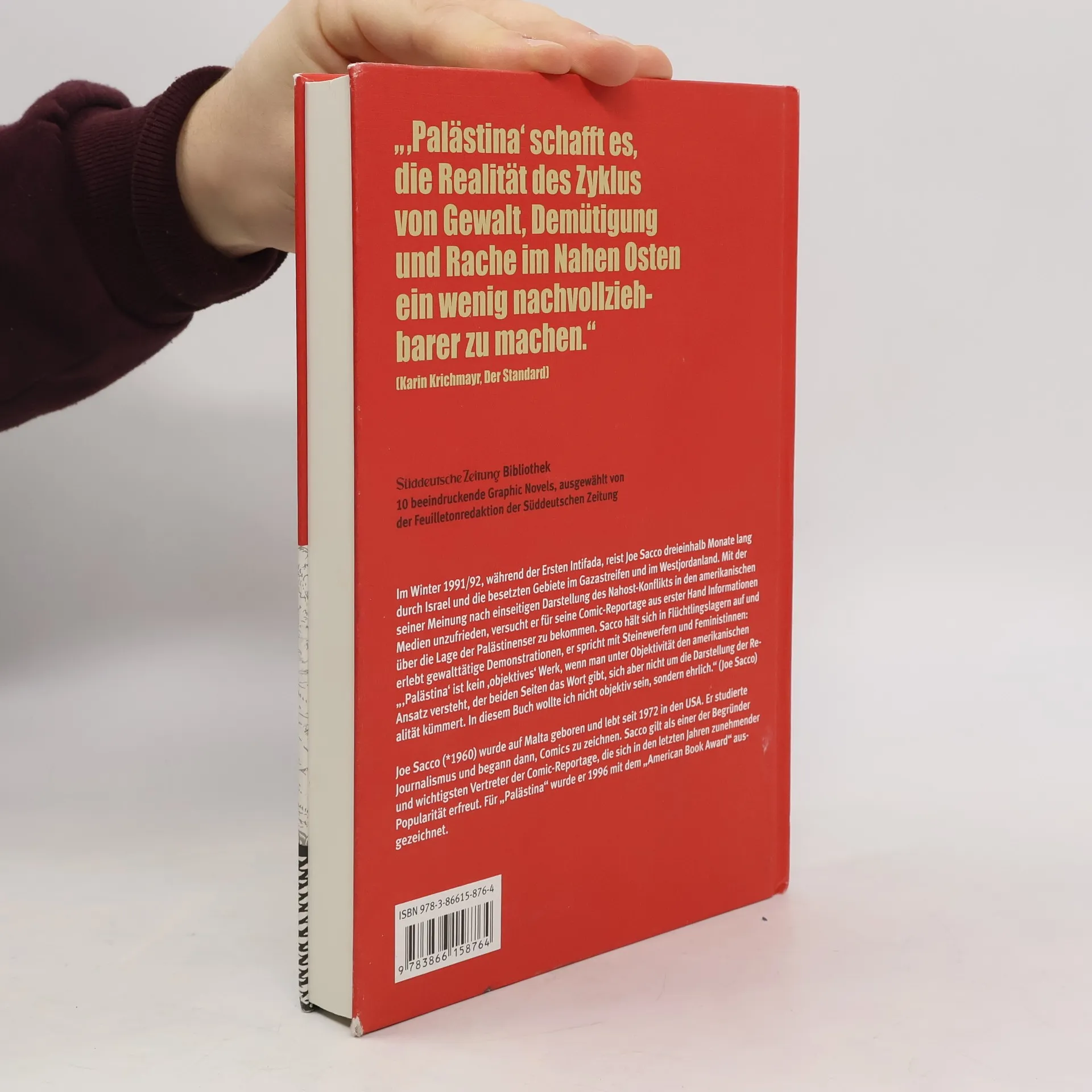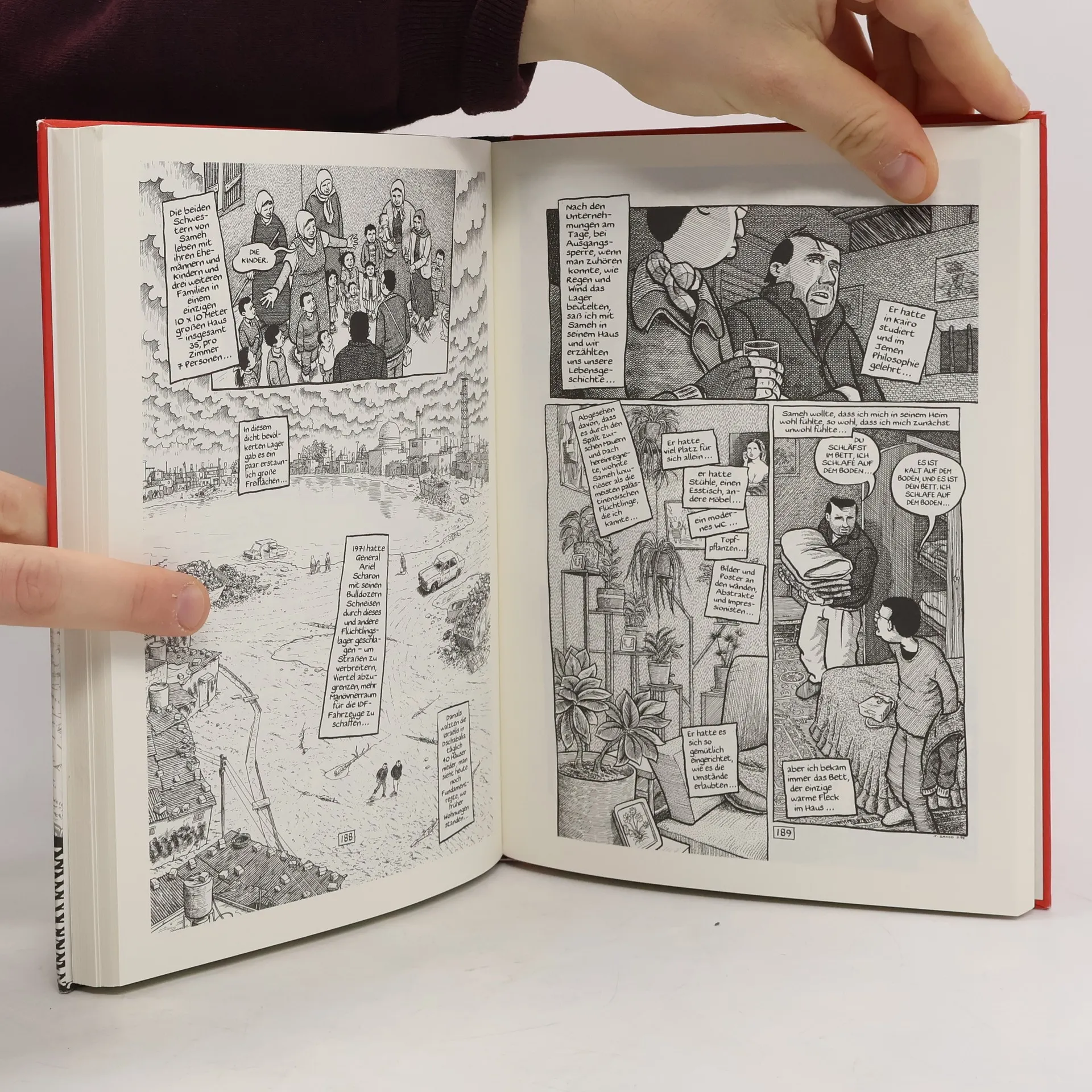 In eindringlichen Schwarz-Weiß-Zeichnungen skizziert Joe Sacco die beklemmende Situation der Menschen in den besetzten Palästinensergebieten, die er 1991 bereist hat. Die Eindringlichkeit seiner Bilder und die teils chaotisch anmutenden Textfelder verstärken diesen Eindruck. Ausgezeichnet wurde „Palästina“ 1996 mit dem „American Book Award“.