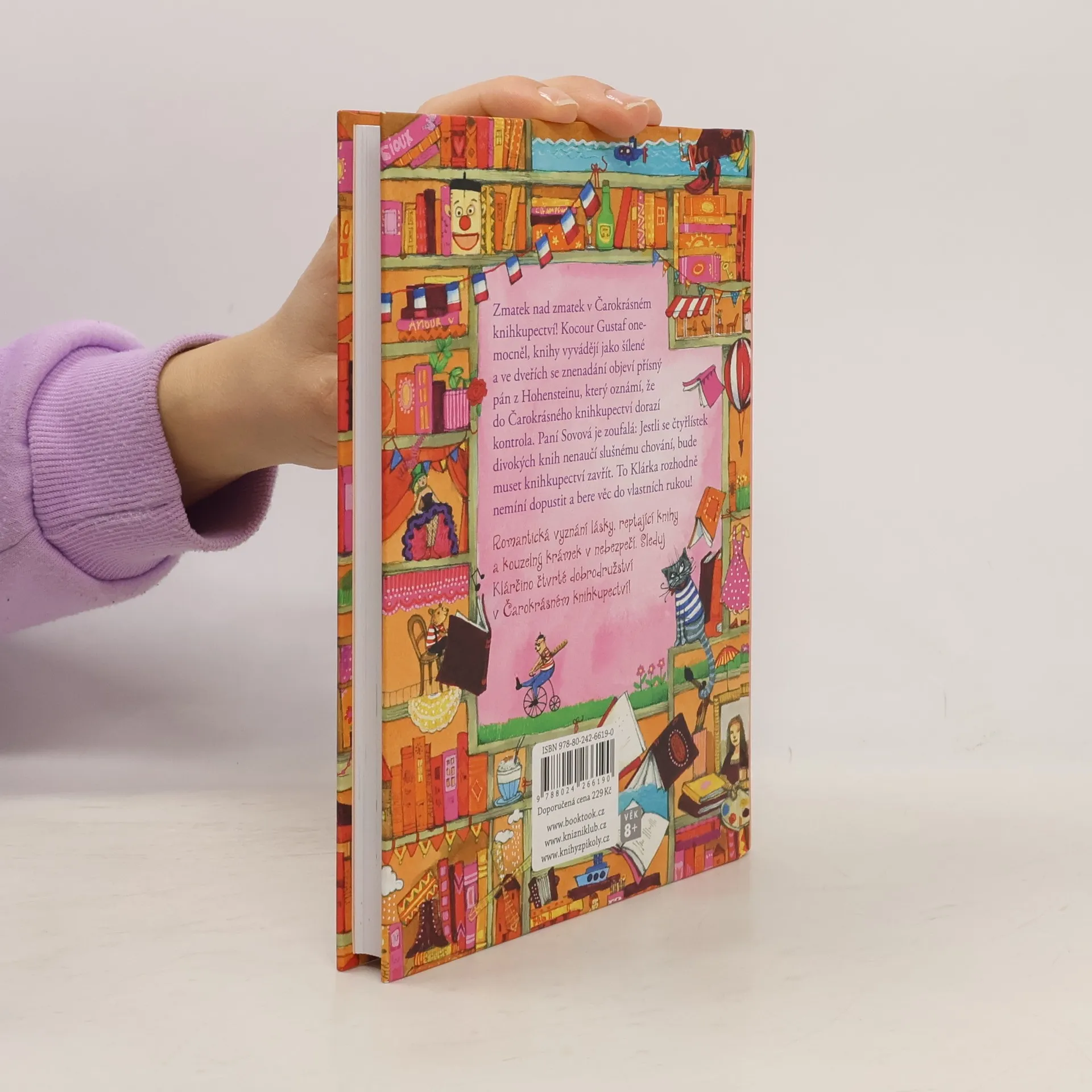 Zmatek nad zmatek v Čarokrásném knihkupectví! Kocour Gustaf onemocněl, knihy vyvádějí jako šílené a do obchůdku má dorazit kontrola! Paní Sovová je zoufalá: Jestli se čtyřlístek divokých knih nenaučí slušnému chování, bude muset knihkupectví zavřít. To Klárka rozhodně nemíní dopustit a bere věc do vlastních rukou! Romantická vyznání lásky, reptající knihy a Čarokrásné knihkupectví v nebezpečí. Sleduj Klárčino čtvrté dobrodružství. Kniha je určena dětem od 8 let.