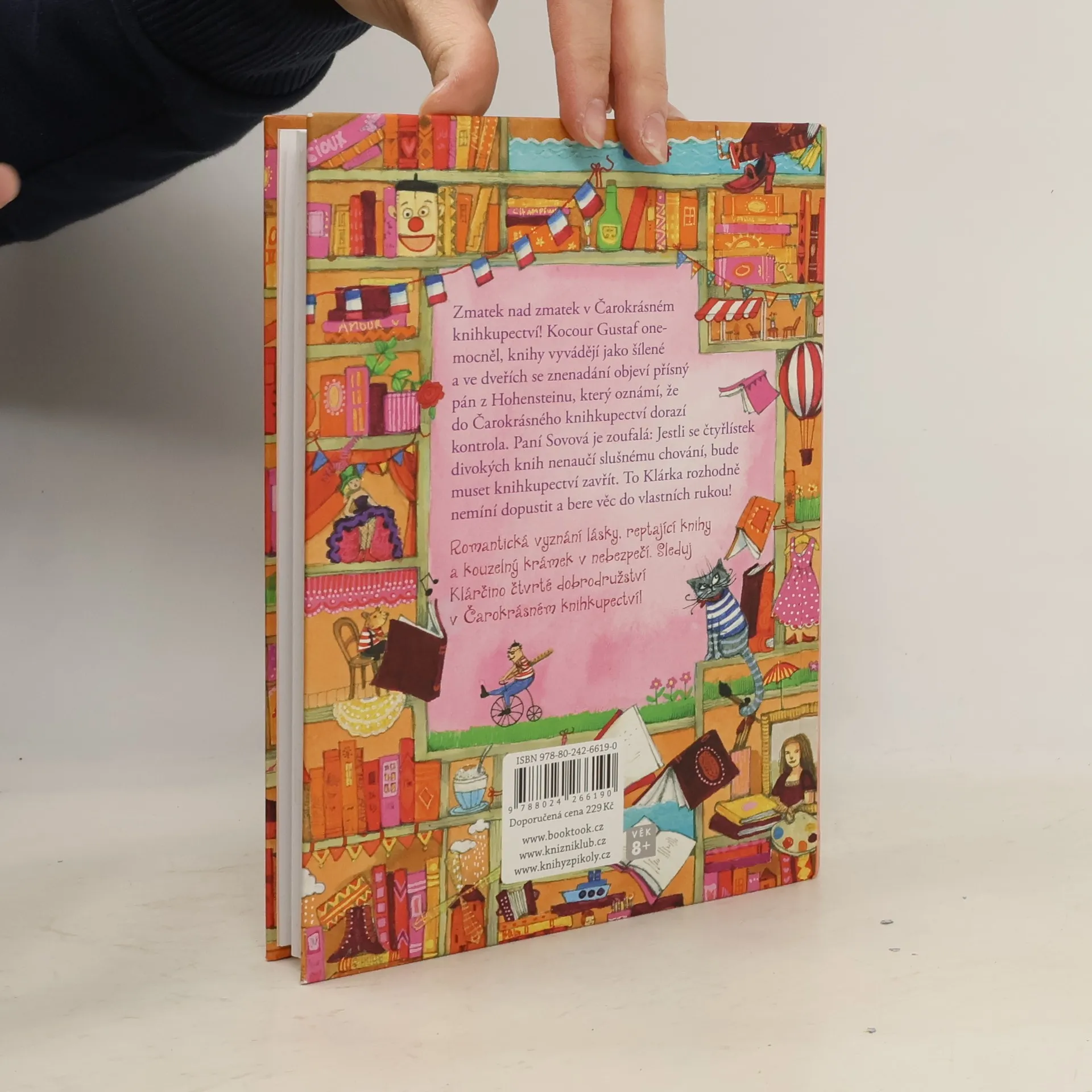 Zmatek nad zmatek v Čarokrásném knihkupectví! Kocour Gustaf onemocněl, knihy vyvádějí jako šílené a do obchůdku má dorazit kontrola! Paní Sovová je zoufalá: Jestli se čtyřlístek divokých knih nenaučí slušnému chování, bude muset knihkupectví zavřít. To Klárka rozhodně nemíní dopustit a bere věc do vlastních rukou! Romantická vyznání lásky, reptající knihy a Čarokrásné knihkupectví v nebezpečí. Sleduj Klárčino čtvrté dobrodružství. Kniha je určena dětem od 8 let.