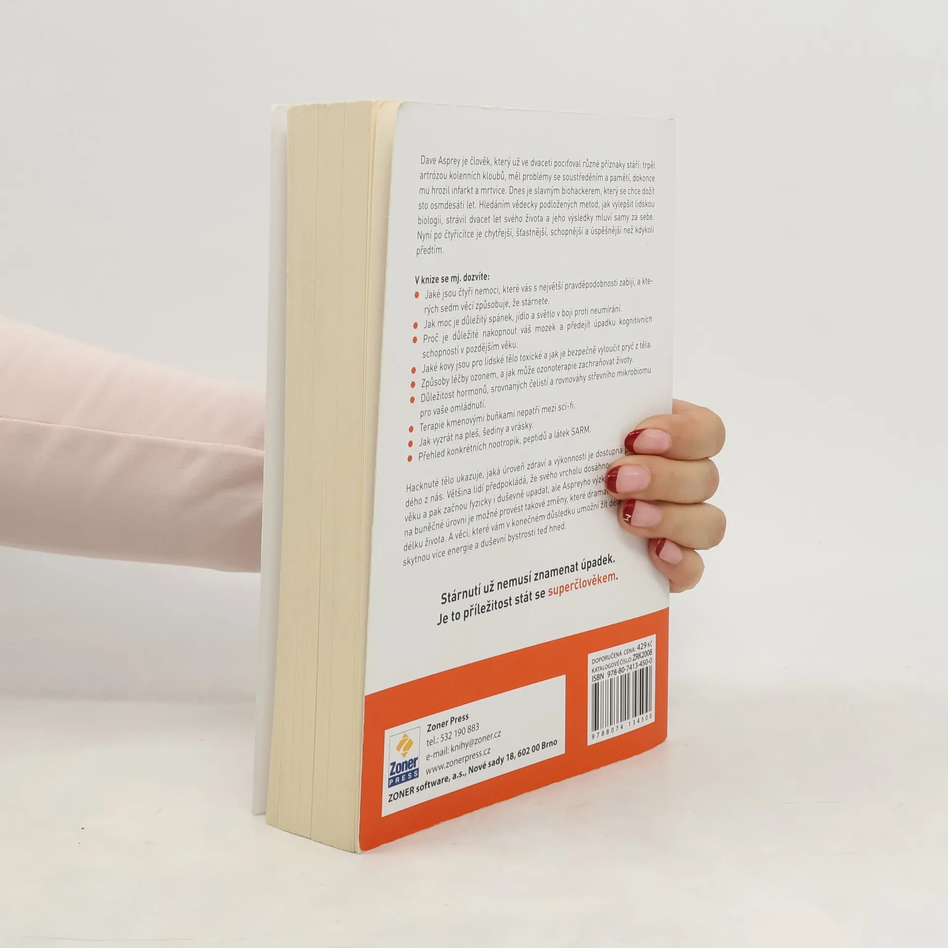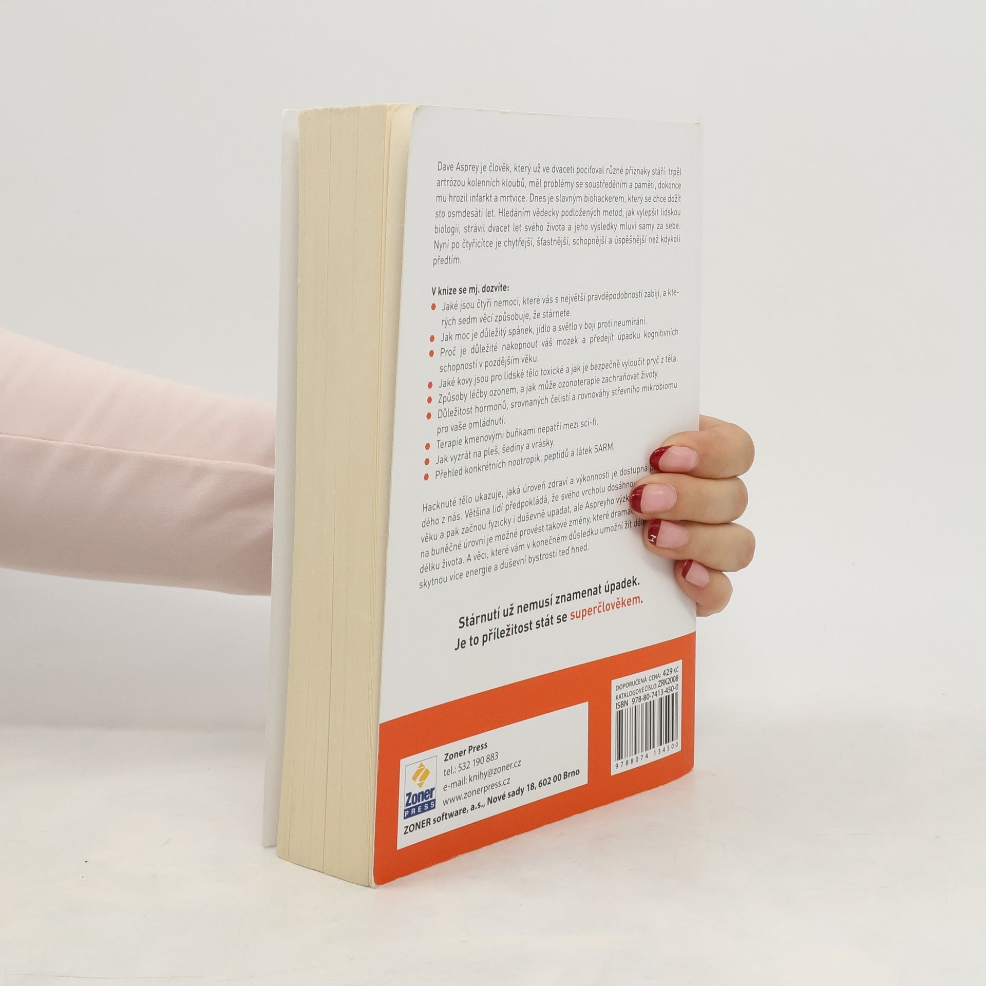 Dave Asprey, biohacker a zakladatel hnutí za zdravější životní styl, se ve svých dvaceti letech potýkal s vážnými zdravotními problémy, které mu hrozily infarktem a mrtvicí. Po dvaceti letech výzkumu se transformoval na úspěšného muže, který usiluje o dožití se sto osmdesáti let. V knize se dozvíte o čtyřech nejčastějších příčinách úmrtí a sedmi faktorech urychlujících stárnutí. Důraz je kladen na význam spánku, stravy a světla v prevenci stárnutí, stejně jako na stimulaci mozku pro udržení kognitivních schopností. Autor také zmiňuje toxické kovy a metody jejich bezpečného odstranění z těla, léčbu ozonem a důležitost hormonů, čelistní rovnováhy a zdravého mikrobiomu pro omlazení. Terapie kmenovými buňkami jsou představeny jako realistická možnost, zatímco se nabízí řešení pro plešatost, šediny a vrásky. Obsahuje také přehled nootropik a peptidů. Aspreyho přístup ukazuje, že stárnutí nemusí znamenat úpadek, ale může být příležitostí k dosažení vyšší úrovně zdraví a výkonnosti, což přináší více energie a duševní bystrosti.
