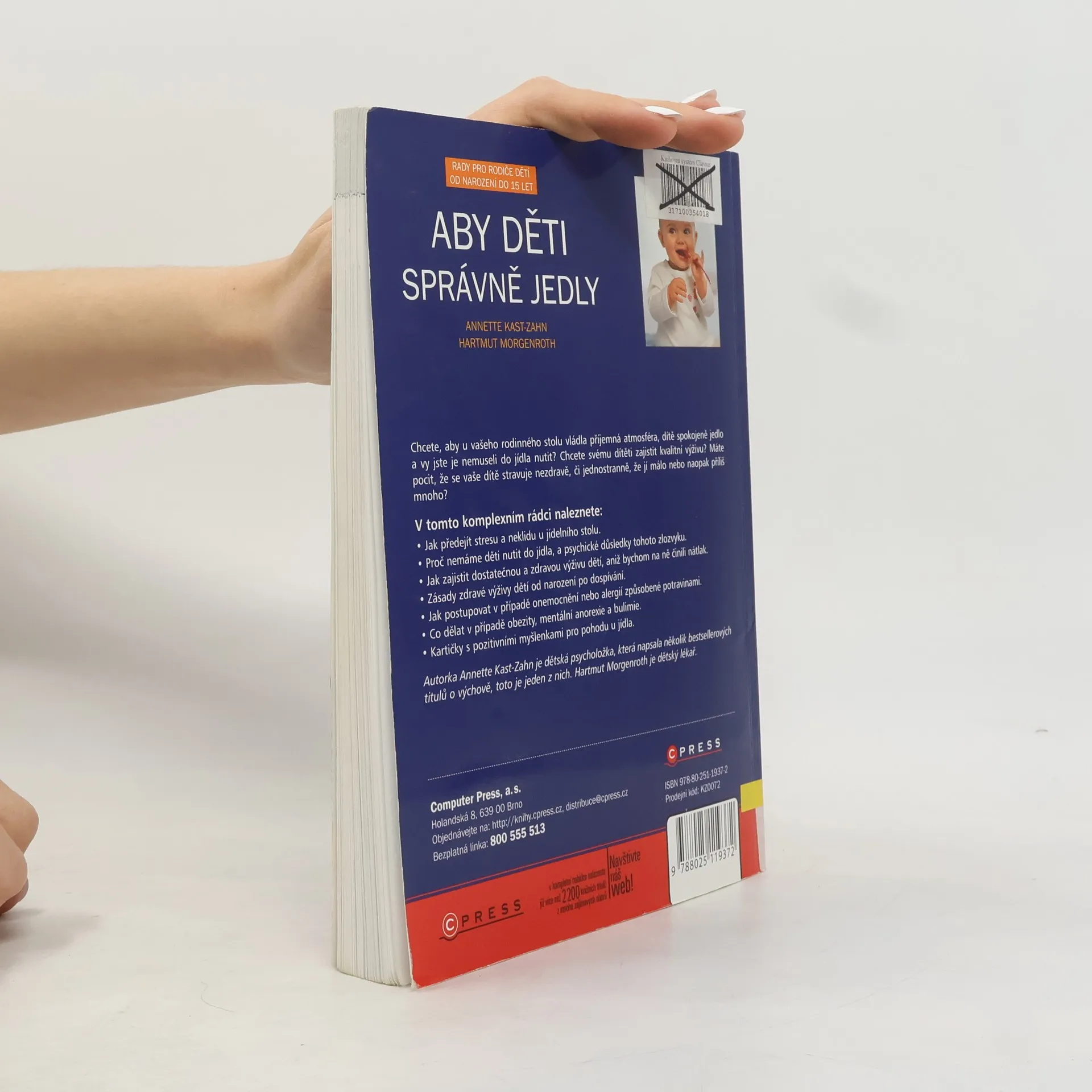Každý rodič zná potíže, které se dají zažít s dítětem u stolu. Zlobení, strkání do talíře, věčné odbíhání, pokapaná podlaha, jídlo ve vlasech, hltání, přecpávání se nebo naopak odmítání připraveného jídla. Věčný pocit stresu a nevděku. Autorka je zkušená dětská psycholožka, která rodičům poradí jak tyto jevy zvládat, a své rady člení do kapitol dle věku dítěte. Kniha patří do bestsellerové čtyřdílné série této autorky. Chcete, aby u vašeho rodinného stolu vládla příjemná atmosféra, dítě spokojeně jedlo a vy jste je nemuseli do jídla nutit? Chcete svému dítěti zajistit kvalitní výživu? Máte pocit, že se vaše dítě stravuje nezdravě, či jednostranně, že jí málo nebo naopak příliš mnoho? V tomto komplexním rádci naleznete: Jak předejít stresu a neklidu u jídelního stolu. Proč nemáme děti nutit do jídla, a psychické důsledky tohoto zlozvyku. Jak zajistit dostatečnou a zdravou výživu dětí, aniž bychom na ně činili nátlak. Zásady zdravé výživy dětí od narození po dospívání. Jak postupovat v případě onemocnění nebo alergií způsobené potravinami. Co dělat v případě obezity, mentální anorexie a bulimie. Kartičky s pozitivními myšlenkami pro pohodu u jídla. O autorce: Annette Kast-Zahn je dětská psycholožka, která napsala několik bestsellerových titulů o výchově, toto je jeden z nich. Hartmut Morgenroth je dětský lékař.