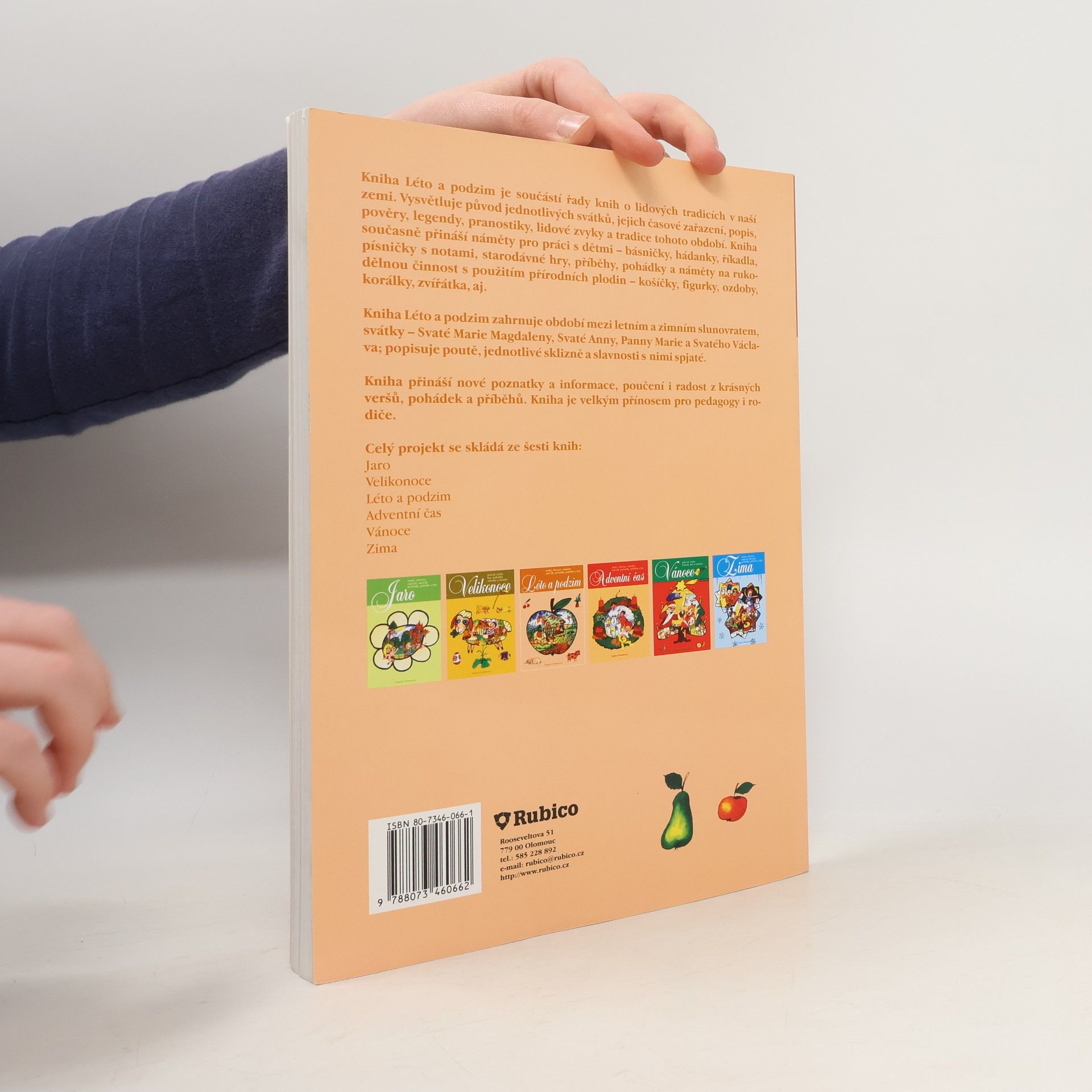 Výborná kniha z edice o lidových tradicích a zvycích v naší zemi. Jedná se o šest samostatných publikací: Zima, Jaro, Velikonoce, Léto a podzim, Adventní čas, Vánoce. V knize naleznete: charakteristiku období, pověry, legendy, pranostiky, lidové zvyklosti a tradice, jejich původ a využití v práci s dětmi - básničky, hádanky, lidová vinšování a říkadla, písničky, povídky, pohádky a náměty pro rukodělnou činnost. Období zahrnuje světce a zvyklosti: Svatá Magdalena, Svatá Anna, Panna Maria, Svatý Václav, dožínky, dočesná, vinobraní, len a konopí, brambory, řepa, ovoce a zelenina, poutě. Můžete se s knihou naučit starodávné dětské hry s míčem, blechou a špačkem