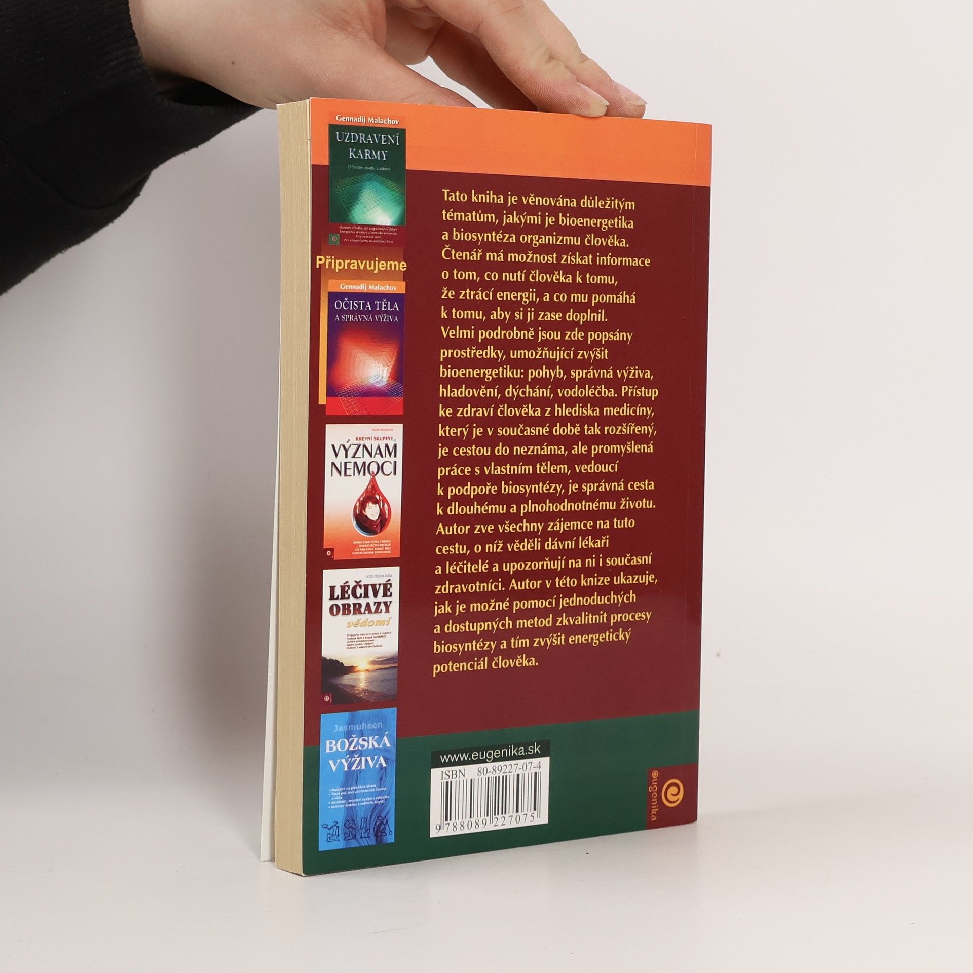 Cesty zvýšení energetického potenciálu Tato kniha je věnována důležitým tématům, jakými je bioenergetika a biosyntéza člověka. Čtenář má možnost získat informace o tom, co nutí člověka k tomu, že ztrácí energie, a co mu pomáhá k tomu, aby si ji zase doplnil. velmi podrobně jsou zde popsány prostředky, umožňující zvýšit bioenergetiku: pohyb, správní výživa, hladovění, dýchání, vodoléčba.