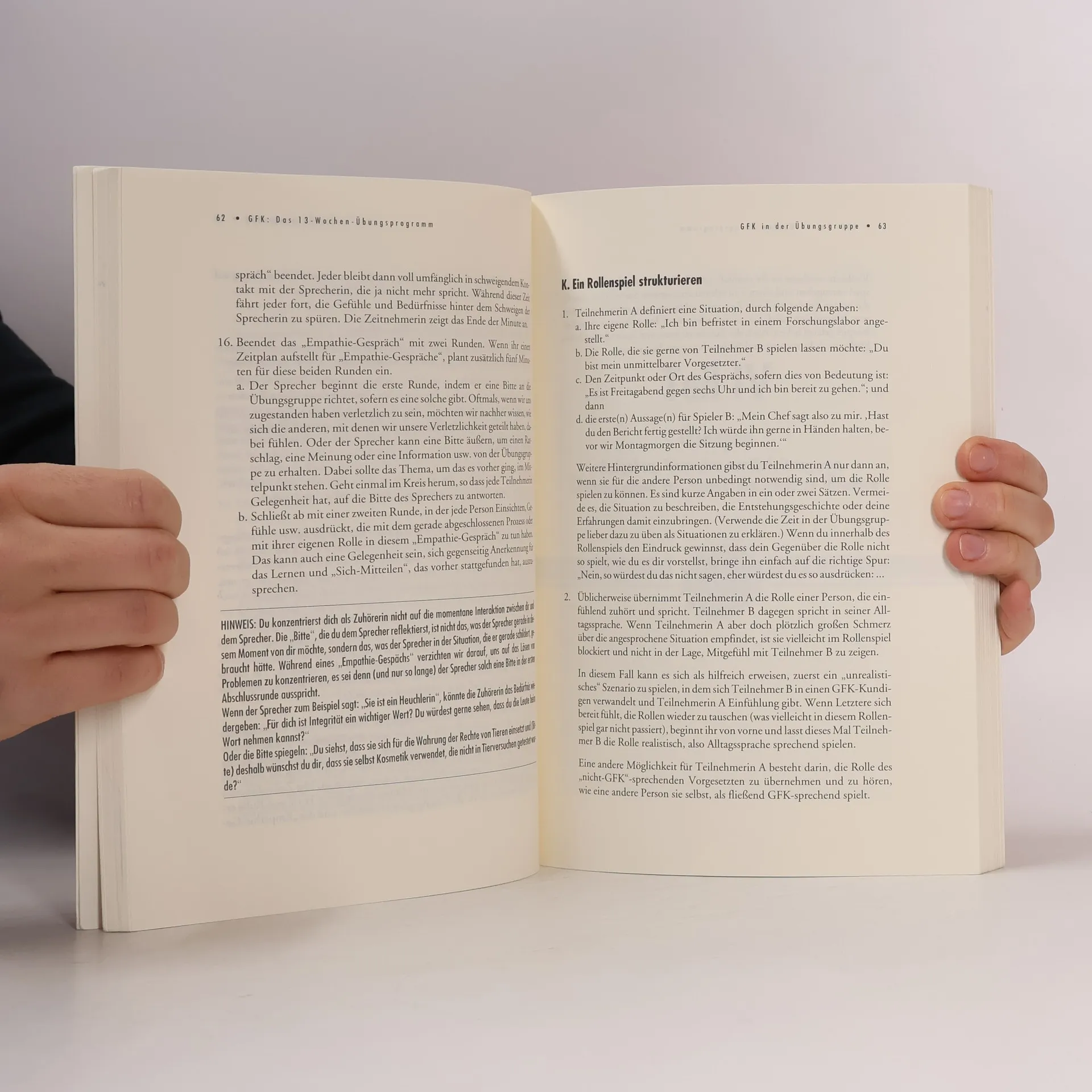 Dieses Übungsbuch bietet Unterrichtsmaterial für einen 13-wöchigen Lehrgang in Gewaltfreier Kommunikation. Es orientiert sich an Marshall B. Rosenbergs Grundlagenwerk „Gewaltfreie Kommunikation“. Gewaltfreie Kommunikation (GFK) zu erlernen ist der Erfahrung vergleichbar, wenn wir eine Fremdsprache lernen wollen. Wir müssen zunächst gewisse Grundkonzepte begreifen - sozusagen die Grammatik erlernen. Erst dann können wir anfangen, auf dieser soliden Grundlage mit der Sprache umzugehen. Glücklicherweise kann Gewaltfreie Kommunikation, im Unterschied zu einer Fremdsprache, an jedem Ort und mit jeder Person angewendet werden. Wir brauchen kein Gegenüber, das GFK beherrscht: Wir können üben, wenn wir einen Scheck auf der Bank einlösen, wenn wieder mal ein Telefonwerber uns beim Mittagessen stört, wenn wir Wahlkampfreden am Fernsehschirm verfolgen, wenn ein Polizist unser Auto anhält. Wir können mit unseren Eltern und Kindern üben, mit Mitarbeitern, Vorgesetzten, Freunden, Geliebten, Fremden, sogar mit unseren Feinden und, was vielleicht am wichtigsten ist, mit uns selbst.