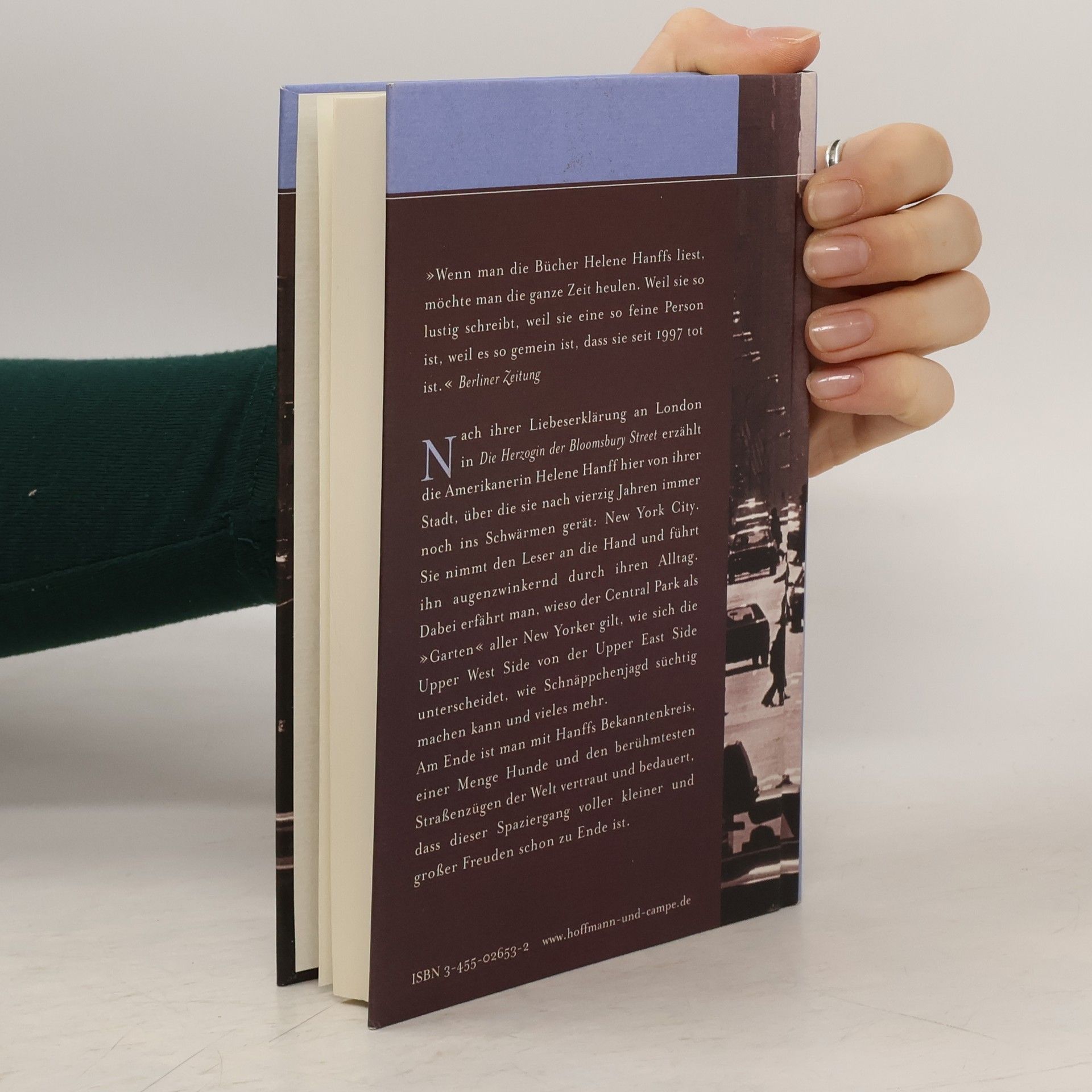 „Wenn man die Bücher Helene Hanffs liest, möchte man die ganze Zeit heulen. Weil sie so lustig schreibt, weil sie eine so feine Person ist, weil es so gemein ist, dass sie seit 1997 tot ist.“ Berliner Zeitung. Die beliebte Autorin lebt seit vier Jahrzehnten in New York, als sie für eine BBC-Radiosendung Geschichten aus ihrer Stadt erzählt. Ihre Begeisterungsfähigkeit ist dabei unverkennbar. Mit Leib und Seele New Yorker erzählt sie in ihrer einzigartigen Art von ihrem Leben, ihrem Freundeskreis und der Stadt selbst. Ursprünglich für sechs Monate geplant, werden die Beiträge zu einem sechsjährigen Projekt und schließlich zu einem Buch. Sie erklärt, warum der Central Park als „Garten“ aller New Yorker gilt, die Unterschiede zwischen Upper West Side und Upper East Side und die Ursprünge der zahlreichen Paraden auf den Straßen. Zudem erfahren wir, wie Arlene, die Hunde eigentlich nicht mag, Freundschaft mit dem Bobtail Bentley schließt, was auf Ninas Dachgarten blüht und wie die Autorin rechtzeitig einen Brautjungfern-Hosenanzug im New Yorker Modedschungel findet. Helene Hanffs Alltag ist ein Geschenk, das uns die kleinen, aber bedeutenden Details des Lebens näherbringt.