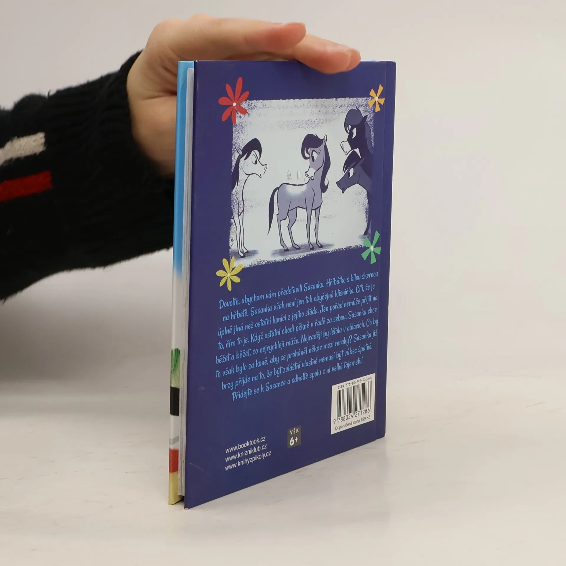 Seznamte se se Sasankou. Hříbátkem se zvláštní bílou skvrnou na hřbetě. Sasanka však není jen tak obyčejná klisnička. Cítí, že je úplně jiná, než ostatní koníci z jejího stáda. Jen pořád nemůže přijít na to, čím to je. Když ostatní chodí pěkně v řadě za sebou, Sasanka chce běžet a běžet, co nejrychleji může. Nejraději by létala v oblacích. Co by to však bylo za koně, aby se proháněl někde mezi mraky? Sasanka již brzy přijde na to, že být zvláštní vlastně nemusí být vůbec špatné. Přidejte se k Sasance a rozlouskněte spolu s ní velké tajemství.