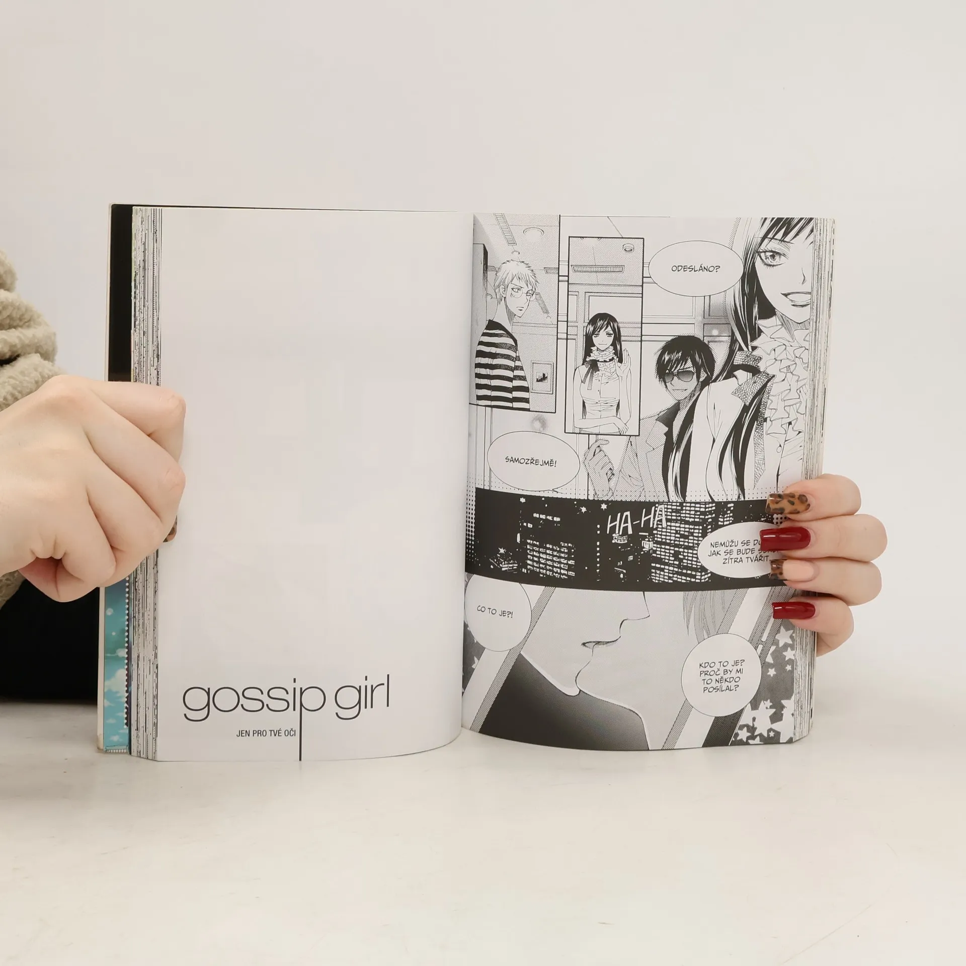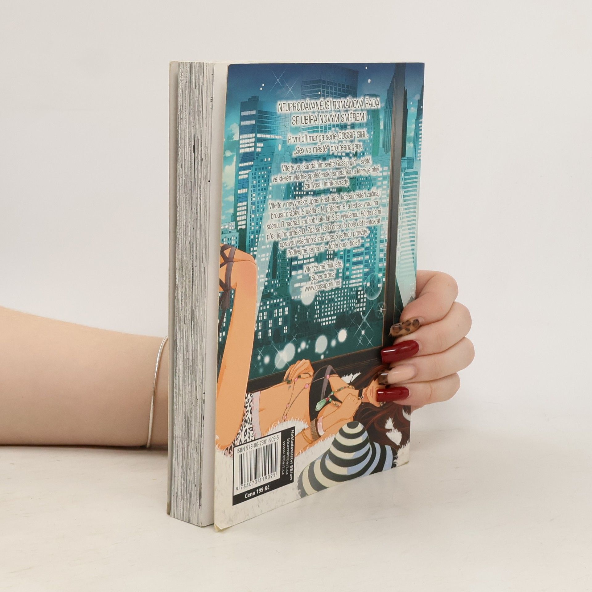 Nejprodávanější románová řada se ubírá novým směrem! První díl manga série GOSSIP GIRL. „Sex ve městě“ pro teenagery. Vítejte ve skandálním světě Gossip Girl – světě, ve kterém vládne společenská smetánka, plného žárlivosti, zrad a intrik. Vítejte v newyorské Upper East Side, kde si někteří začínají brousit drápky! S ulétla s N, přítelem B, a se vrací na scénu. B nachází způsob, jak dát S za vyučenou. Půjde na ni přes jejího přítele, D. Zdá se, že B chce do boje dát tentokrát opravdu všechno a zbavit se S jednou provždy. Podívejme se na ni – tohle bude bolet!