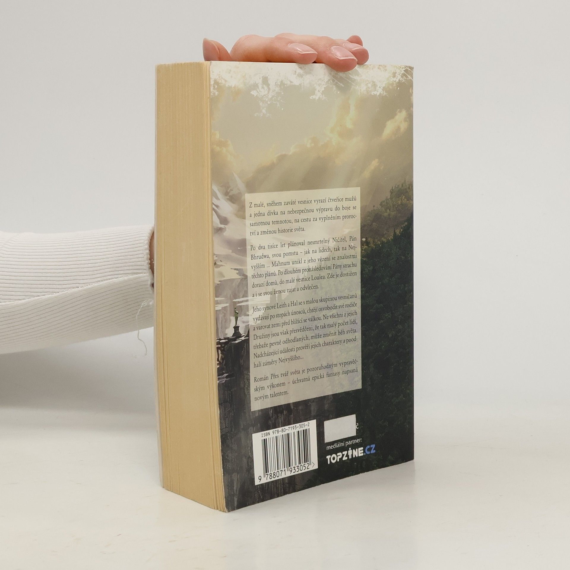 1. kniha série Oheň nebe. Z malé, sněhem zaváté vesnice vyrazí čtveřice mužů a jedna dívka na nebezpečnou výpravu do boje se samotnou temnotou, na cestu za vyplněním proroctví a změnou historie světa. Po dva tisíce let plánoval nesmrtelný Ničitel, Pán Bhrudwa, svou pomstu – jak na lidech, tak na Nejvyšším… Mahnum unikl z jeho vězení se znalostmi těchto plánů. Po dlouhém pronásledování Pány strachu dorazí domů, do malé vesnice Loulea. Zde je dostižen a i se svou ženou zajat a odvlečen. Jeho synové Leith a Hal se s malou skupinou vesničanů vydávají po stopách únosců, chtějí rodiče osvobodit a varovat zemi před blížící se válkou. Ne všichni z jejich Družiny jsou však přesvědčeni, že tak malý počet, třebaže odhodlaných lidí, může změnit běh světa. Nadcházející události prověří jejich charaktery a poodhalí záměry Nejvyššího… Román Přes tvář světa je pozoruhodným vypravěčským výkonem – úchvatná epická fantasy napsaná novým talentem.