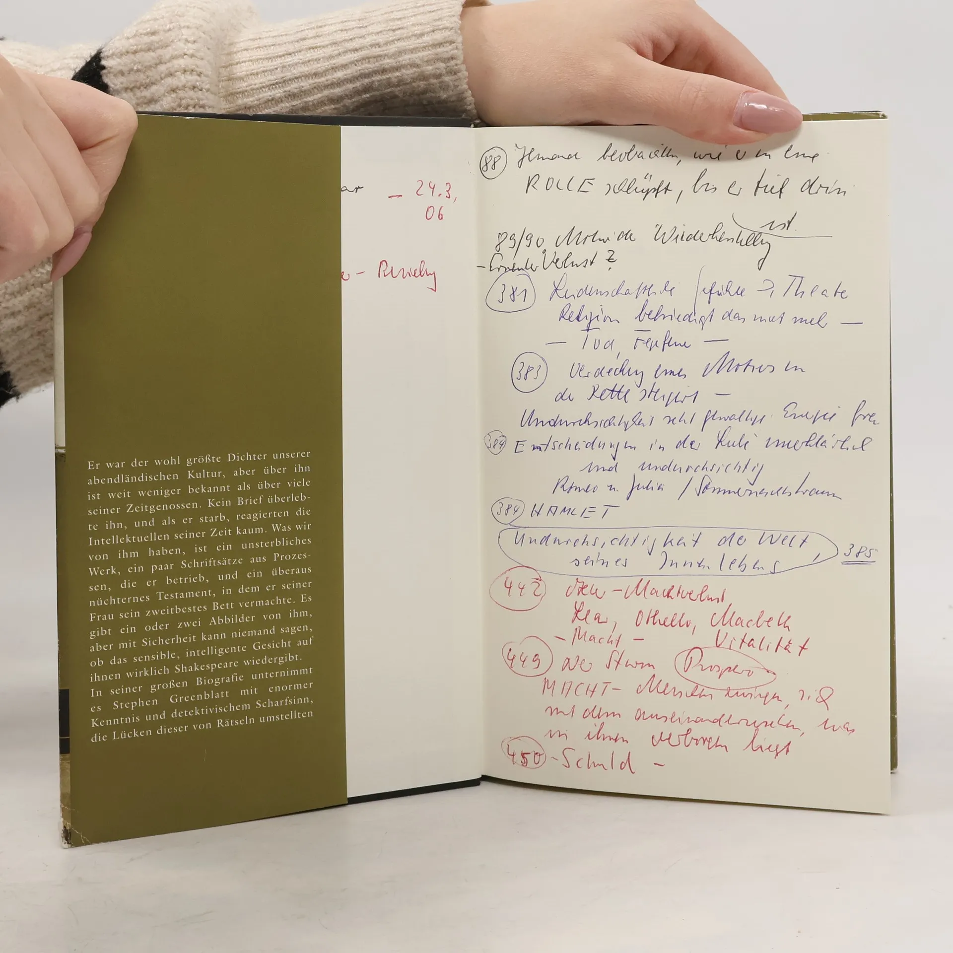 „Er war der wohl größte Dichter unserer abendländischen Kultur, aber über ihn ist weit weniger bekannt als über viele seiner Zeitgenossen. Kein Brief überlebte ihn, und als er starb, reagierten die Intellektuellen seiner Zeit kaum. Was wir von ihm haben, ist ein unsterbliches Werk, ein paar Schriftsätze aus Prozessen, die er betrieb, und ein überaus nüchternes Testament, in dem er seiner Frau sein zweitbestes Bett vermachte. Es gibt ein oder zwei Abbilder von ihm, aber mit Sicherheit kann nie-mand sagen, ob das sensible, intelligente Gesicht auf ihnen wirklich Shakespeare wiedergibt. In seiner großen Biografie unternimmt es Stephen Greenblatt mit enormer Kennt-nis und detektivischem Scharfsinn, die Lücken dieser von Rätseln umstellten Lebensgeschichte zu füllen, ihre seltsamen Ungewissheiten und Leerstellen zu erklären und Shakespeare zu einer historisch fassbaren Gestalt zu machen. Dieses Werk ist von der Fachwelt lange erwartet worden, und es wird zweifellos als die Shakespeare-Biografie unserer Zeit in die Literaturgeschichte eingehen. “