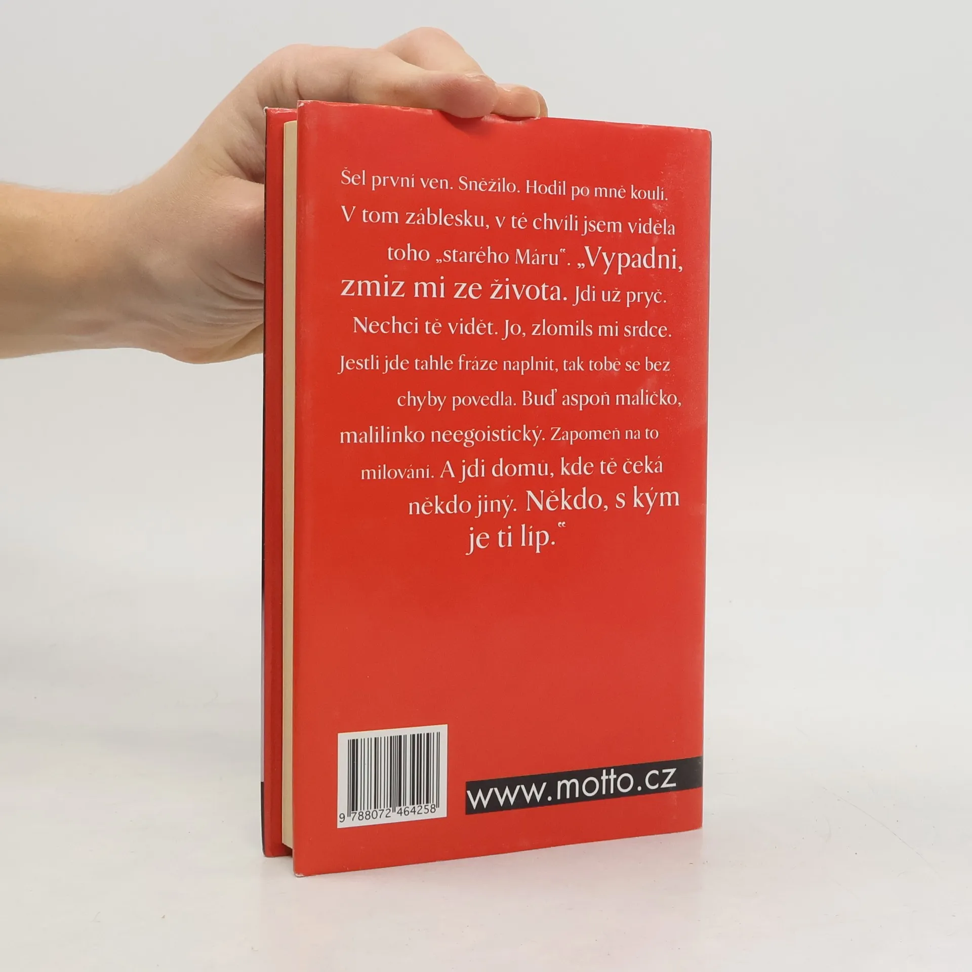 Šel první ven. Sněžilo. Hodil po mně koulí. V tom záblesku, v té chvíli jsem viděla toho "starého Máru". "Vypadni, zmiz mi ze života. Jdi už pryč. Nechci tě vidět. Jo, zlomils mi srdce. Jestli jde tahle fráze naplnit, tak tobě se bez chyby povedla. Buď aspoň maličko, malilinko neegoisticky. Zapomeň na to milování. A jdi domů, kde tě čeká někdo jiný. Někdo, s kým je ti líp."