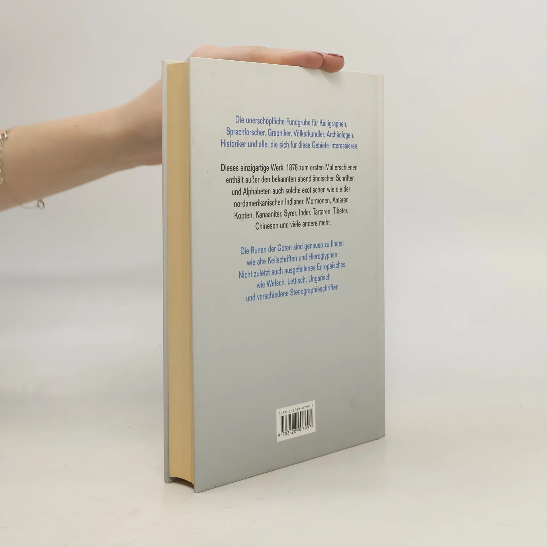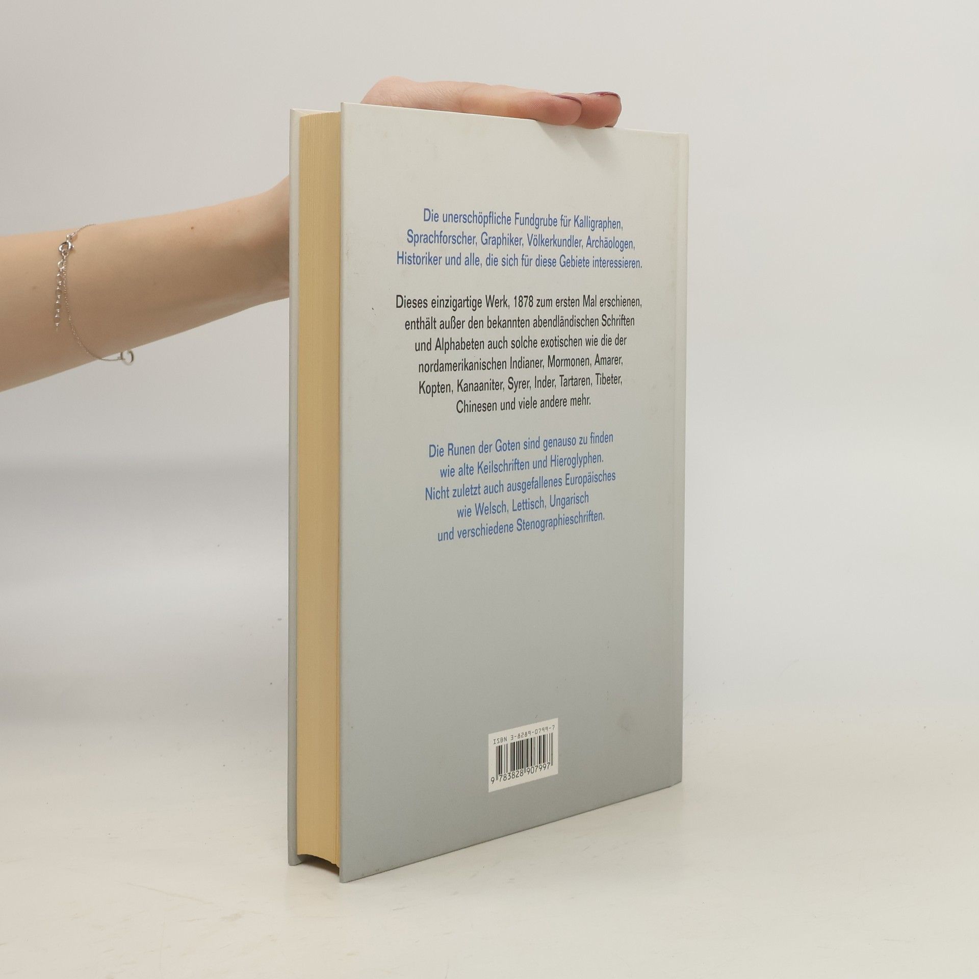 Die unerschöpfliche Fundgrube für Kalligraphen, Sprachforscher, Graphiker, Völkerkundler, Archäologen, Historiker und alle, die sich für diese Gebiete interessieren. Dieses einzigartige Werk - 1878 zum ersten Mal erschienen - enthält außer den bekannten abendländischen Schriften und Alphabeten auch exotische wie die der nordamerikanischen Indianer, Mormonen, Amarer, Kopten, Kanaaniter, Syrer, Inder, Tartaren, Tibeter, Chinesen und viele andere mehr. Auch vergangene Schriftsysteme sind enthalten, etwa die gotischen Runen, Keilschriften und Hieroglyphen.