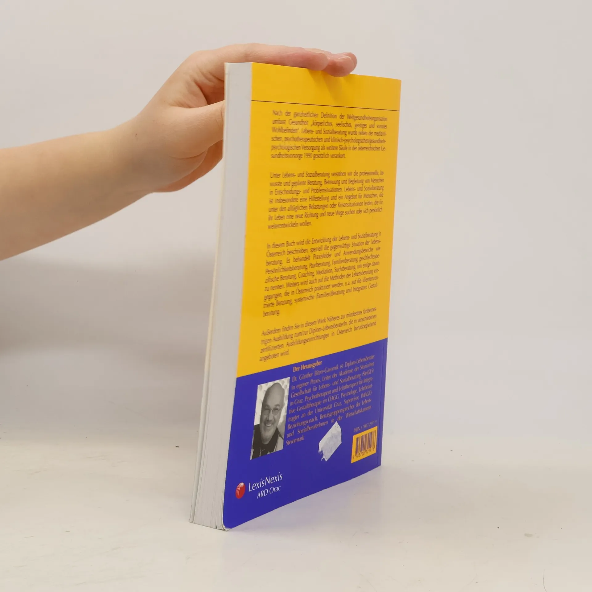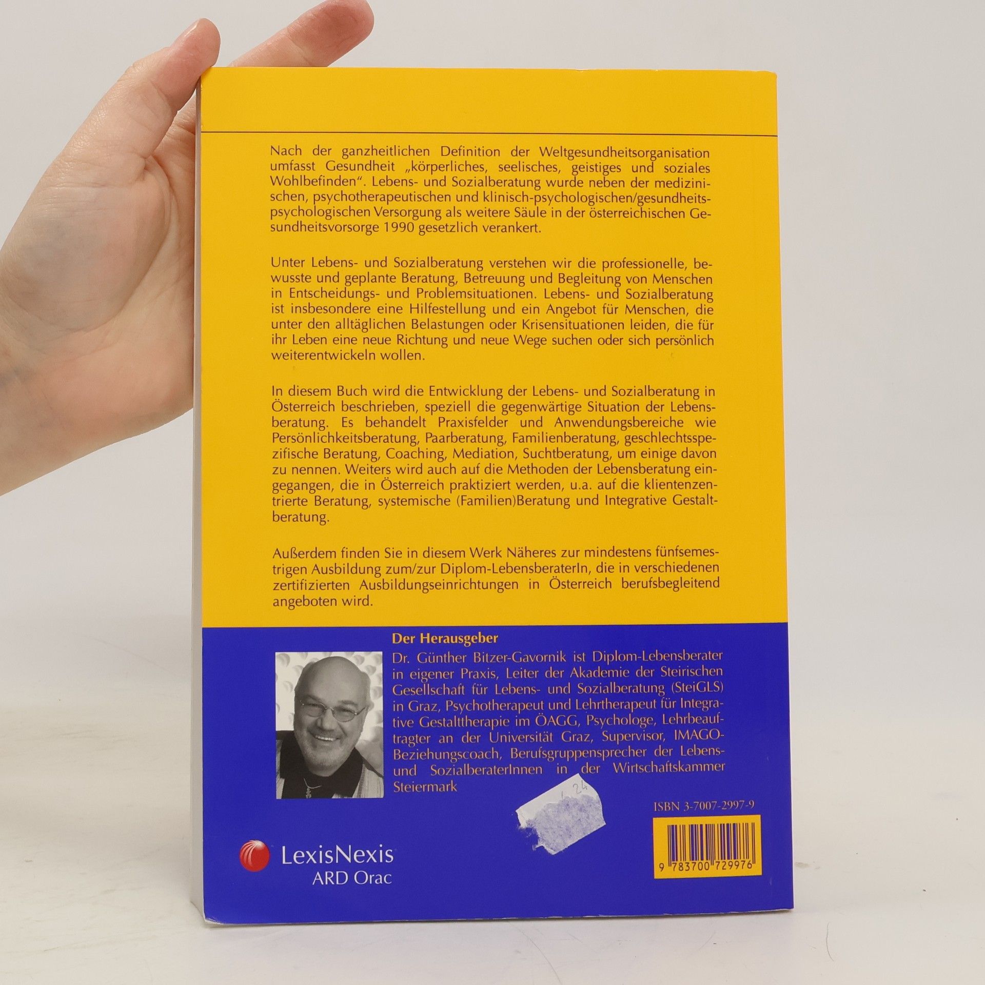 Lebens- und Sozialberatung wurde 1990 als weitere Säule der österreichischen Gesundheitsvorsorge gesetzlich verankert. Unter Lebens- und Sozialberatung ist die professionelle, bewusste und geplante Beratung, Betreuung und Begleitung von Menschen in Entscheidungs- und Problemsituationen zu verstehen. Lebens- und Sozialberatung ist insbesondere eine Hilfestellung und ein Angebot für Menschen, die unter den alltäglichen Belastungen oder Krisensituationen leiden, die für ihr Leben eine neue Richtung und neue Wege suchen oder sich persönlich weiterentwickeln wollen. In diesem Buch wird die Entwicklung und derzeitige Situation der Lebens- und Sozialberatung in Österreich beschrieben. Praxisfelder und Anwendungsbereiche wie Persönlichkeitsberatung, Paarberatung, Familienberatung, Coaching, Mediation, NLP, Karriereberatung, Suchtberatung werden aufgezeigt. Weiters wird auf die Methoden der Lebensberatung eingegangen, die in Österreich praktiziert werden, z. B. klientenzentrierte Beratung, systemische Beratung und Integrative Gestaltberatung. Außerdem finden Sie in diesem Buch Näheres zu Ausbildung und Ausbildungseinrichtungen.