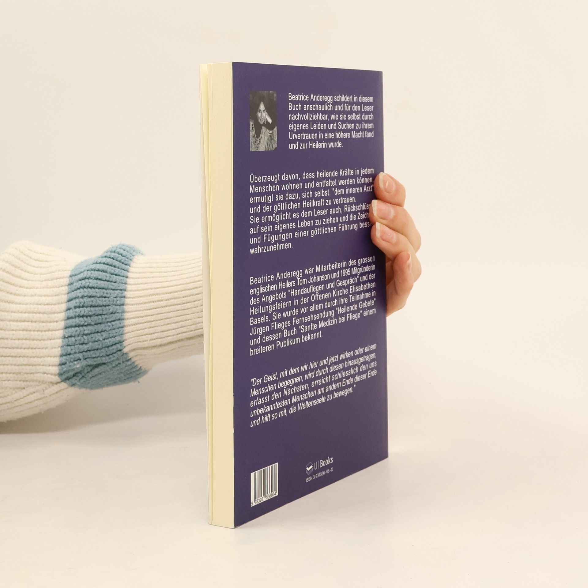 Beatrice Anderegg schildert in diesem Buch anschaulich und für den Leser nachvollziehbar, wie sie selbst durch eigenes Leiden und Suchen zu ihrem Urvertrauen in eine höhere Macht fand und zur Heilerin wurde. Überzeugt davon, dass heilende Kräfte in jedem Menschen wohnen, und entfaltete werden könne, ermutigt Sie dazu, sich selbst „dem inneren Arzt“ und der göttlichen Heilkraft zu vertrauen. Sie ermöglicht es dem Leser auch, Rückschlüsse auf sein eigenes Leben zu ziehen und die Zeichen und Fügungen einer göttlichen Führung besser wahrzunehmen. Beatrice Anderegg war Mitarbeiter des großen englischen Heilers Tom Johanson und 1995 Mitgründerin des Angebots „Handauflegen und Gespräch“ und der Heilungsfeiern in der offenen Kirch Elisabethen Basels. Sie wurde vor allem durch ihre Teilnahem in Jürgen Flieges Fernsehsendung „ Heilende Gebete“ und dessen Buch „Sanfte Medizin bei Fliege“ einem breiteren Publikum bekannt. „Der Geist, mit dem wir hier und jetzt wirken oder einem Menschen begegnen, wird durch diesen hinausgetragen, erfasst den Nächsten, erreicht schließlich den uns unbekanntesten Menschen am andern Ende dieser Erde und hilft so mit, die Weltenseele zu bewegen.“