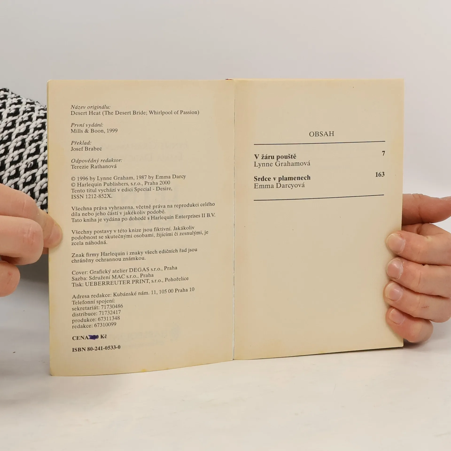 V žáru pouště Aby zabránila svému vyhoštění z exotické arabské země Dataru, tvrdí Bethany, že je blízkou přítelkyní mocného korunního prince Razula- muže, kterého před dvěma lety odmítla. Teď za to musí zaplatit: Razul chce, aby se stala jeho ženou. Srdce v plamenech Ashley vůbec nešlo na rozum, proč se v káhirském kasinu stala středem pozornosti tajemného šejka. Ještě neuvěřitelnější však bylo, že od prvního okamžiku k němu cítila neodolatelnou přitažlivost... Bude to stačit na to, aby mu odpustila, že ji unesl, aby ji měl sám pro sebe?