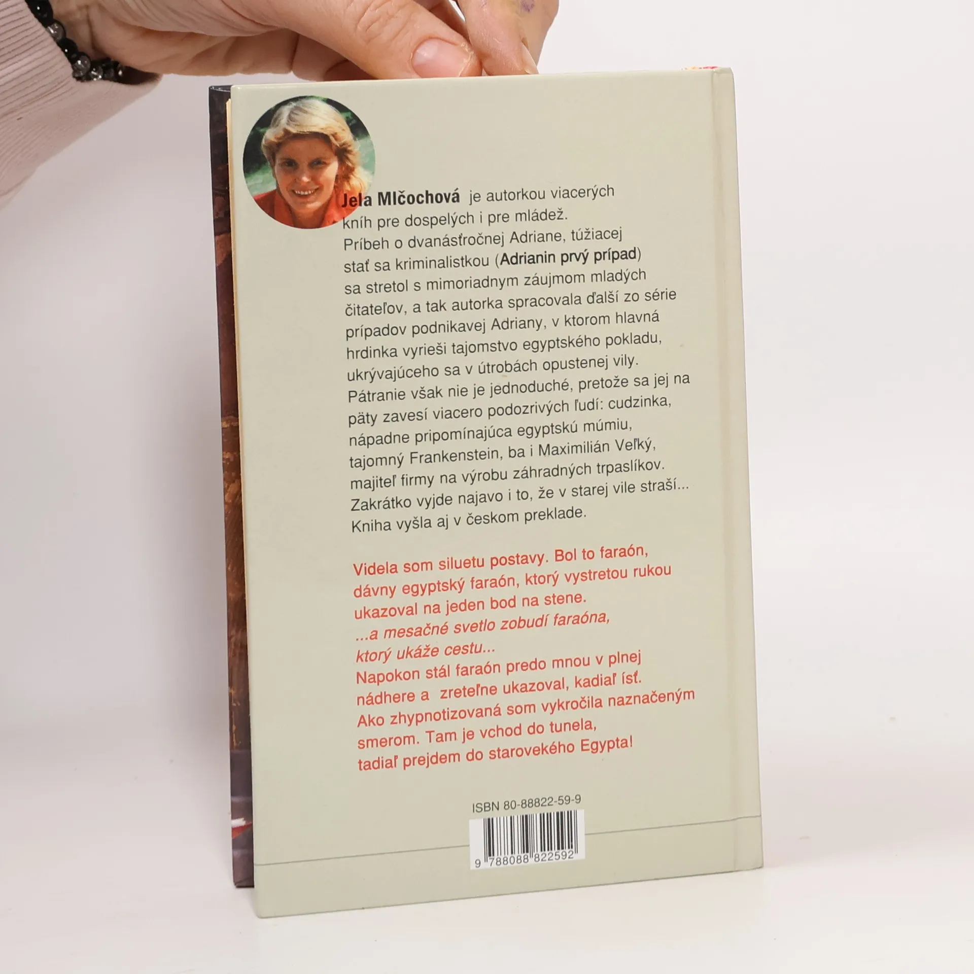 Jela Mlčochová je autorkou viacerých kníh pre dospelých i pre mládež. Príbeh o dvanásťročnej Adriane, túžiacej stať sa kriminalistkou (Adrianin prvý prípad), sa stretol s mimoriadnym záujmom mladých čitateľov, a tak autorka spracovala ďalší zo série prípadov podnikavej Adriany, v ktorom hlavná hrdinka rieši tajomstvo egyptského pokladu, ukrývajúceho sa v útrobách opustenej vily. Pátranie však nie je jednoduché, pretože na päty sa jej zavesí podozrivá cudzinka Bzdocha, nápadne pripomínajúca egyptskú múmiu, tajomný Frankenstein, ba i Maximilián Veľký, majiteľ firmy na výrobu záhradných trpaslíkov. Zakrátko vyjde najavo i to, že v starej vile straší...