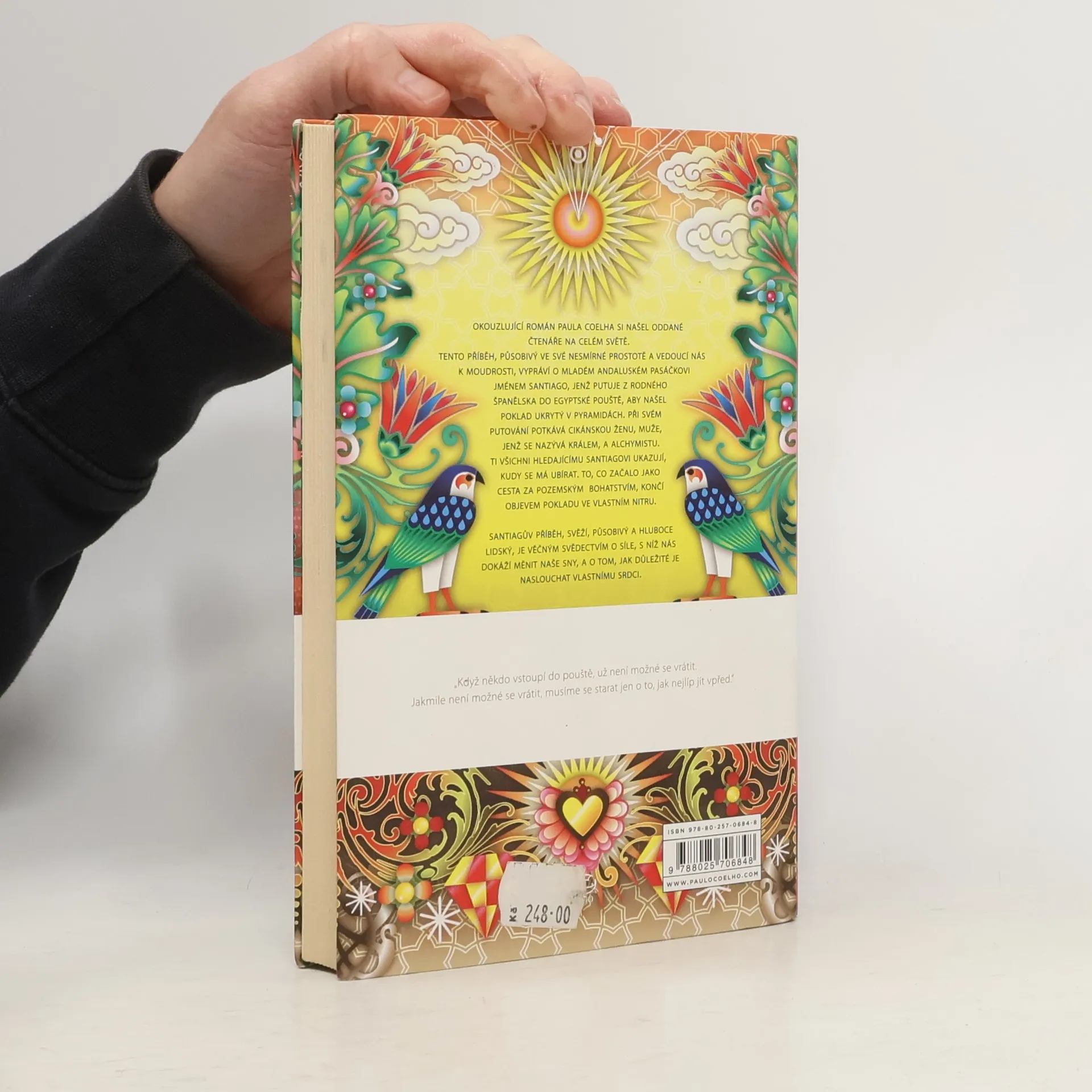 Román Alchymista – největší brazilský bestseller všech dob – byl dosud přeložen do 34 jazyků a prodalo se ho na 10 milionů výtisků. Takřka pohádkové vyprávění o cestě španělského pastýře za zakopaným pokladem, vycházející z příběhu o splněném snu ze sbírky Tisíc a jedna noc, je zároveň výzvou k naplnění vlastního osudu i poznáním posvátnosti světa, v němž žijeme. Na cestě za oním dvojím pokladem, plné zkoušek a důležitých setkání, je třeba dbát všech znamení a s neustálou trpělivostí a odvahou (jako alchymista sledující proměnu obyčejného kovu ve zlato) přetvořit samu svou osobnost.