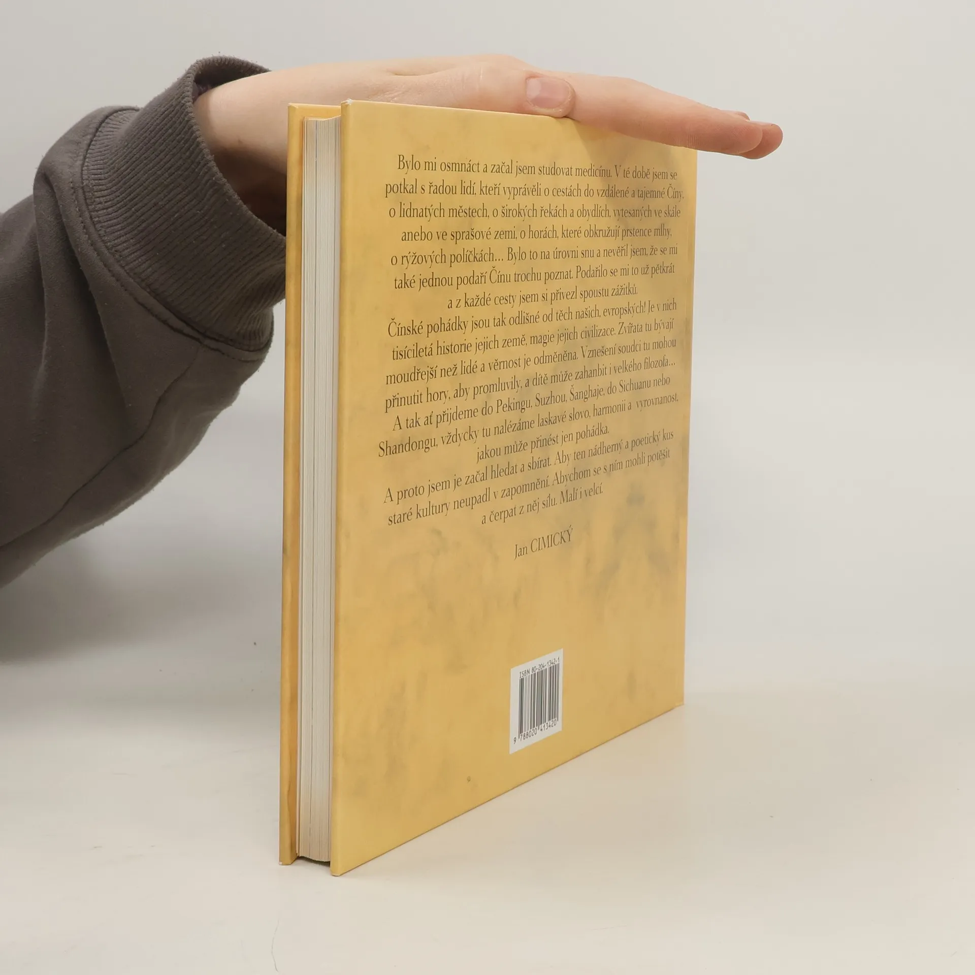 Jan Cimický nevěřil, že se mu jednou podaří Čínu trochu poznat. Podařilo se mu to už pětkrát a z každé cesty si přivezl spoustu zážitků.. a pohádky. Čínské pohádky jsou tak odlišné od těch našich, evropských! Je v nich tisíciletá historie jejich země, magie jejich civilizace. Zvířata tu bývají moudřejší než lidé a věrnost je odměněna. Vznešení soudci tu mohou přinutit hory, aby promluvily, a dítě může zahanbit i velkého filozofa... A tak ať přijdeme do Pekingu, Suzhou, Šanghaje, do Sichuanu nebo Shandongu, vždycky tu nalézáme laskavé slovo, harmonii a vyrovnanost jakou může přinést jen pohádka. A proto je Jan Cimický začal hledat a sbírat. Aby ten nádherný a poetický kus staré kultury neupadl v zapomnění. Abychom se s ním mohli potěšit a čerpat z něj.