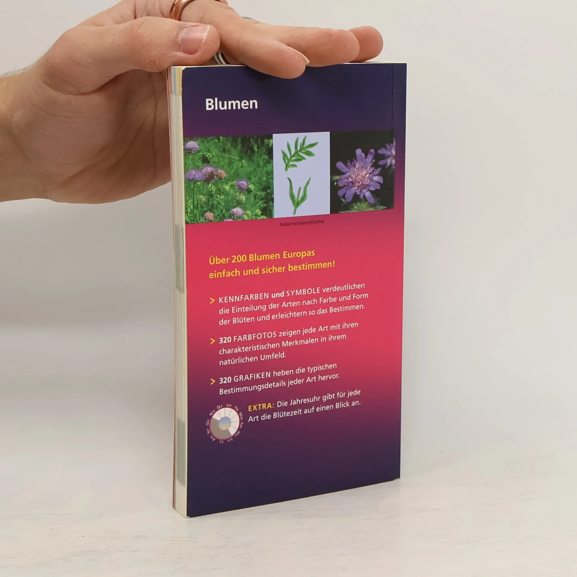Der neue Naturführer „Blumen“ macht das Bestimmen von über 200 europäischen Blumenarten noch einfacher und sicherer durch: - 320 Grafiken, die die typischen Bestimmungsdetails jeder Art deutlicher als Fotos zeigen; - 320 Farbfotos, die jede Art in ihrem natürlichen Umfeld zeigen und jeweils ein charakteristisches Merkmal abbilden; - Kennfarben-Code mit Symbolen, der die Suche nach Blumen durch die Einteilung nach Blütenfarben in fünf Gruppen erleichtert; - Extra: Mithilfe der Jahresuhr können Sie auf einen Blick erkennen, wann die Blume blüht.