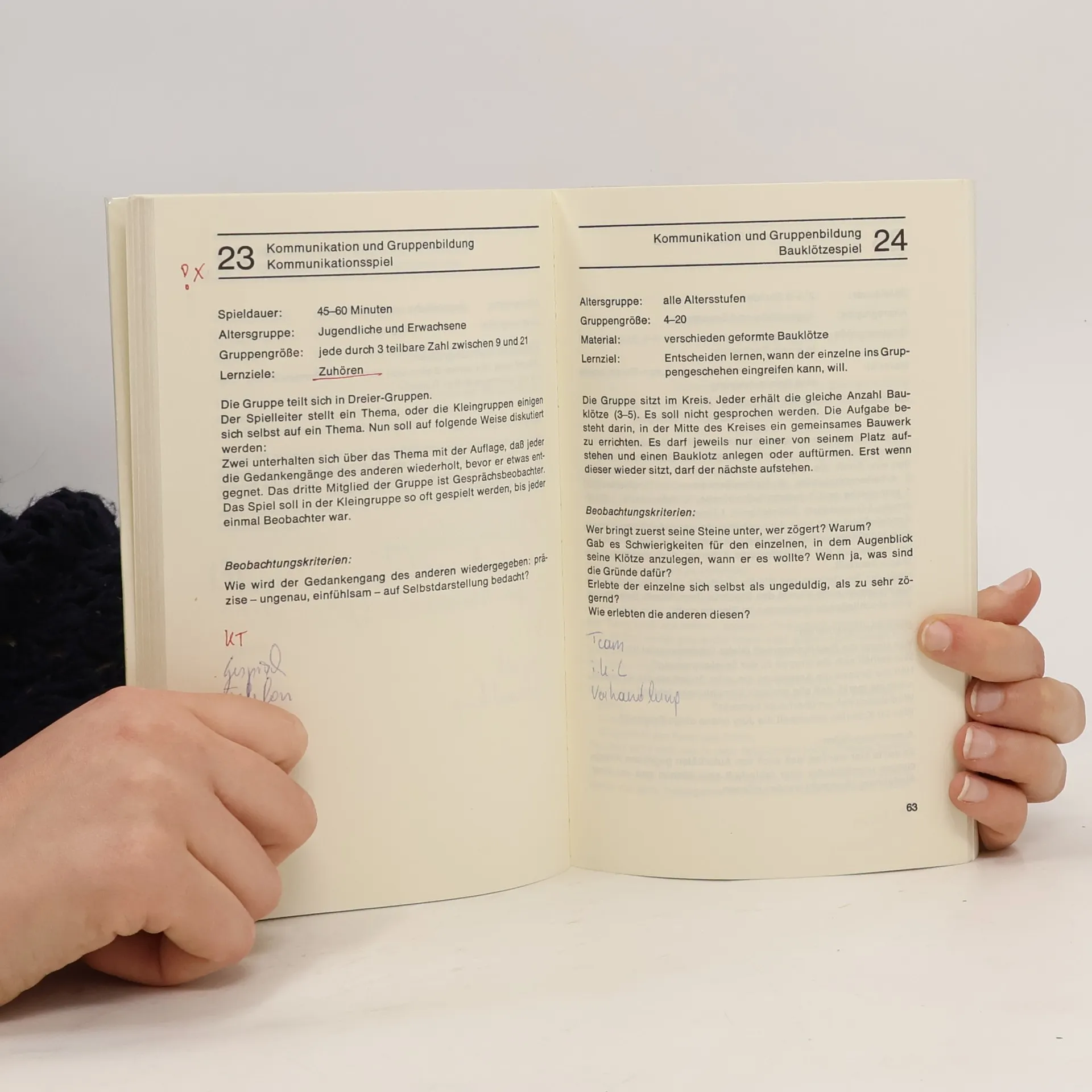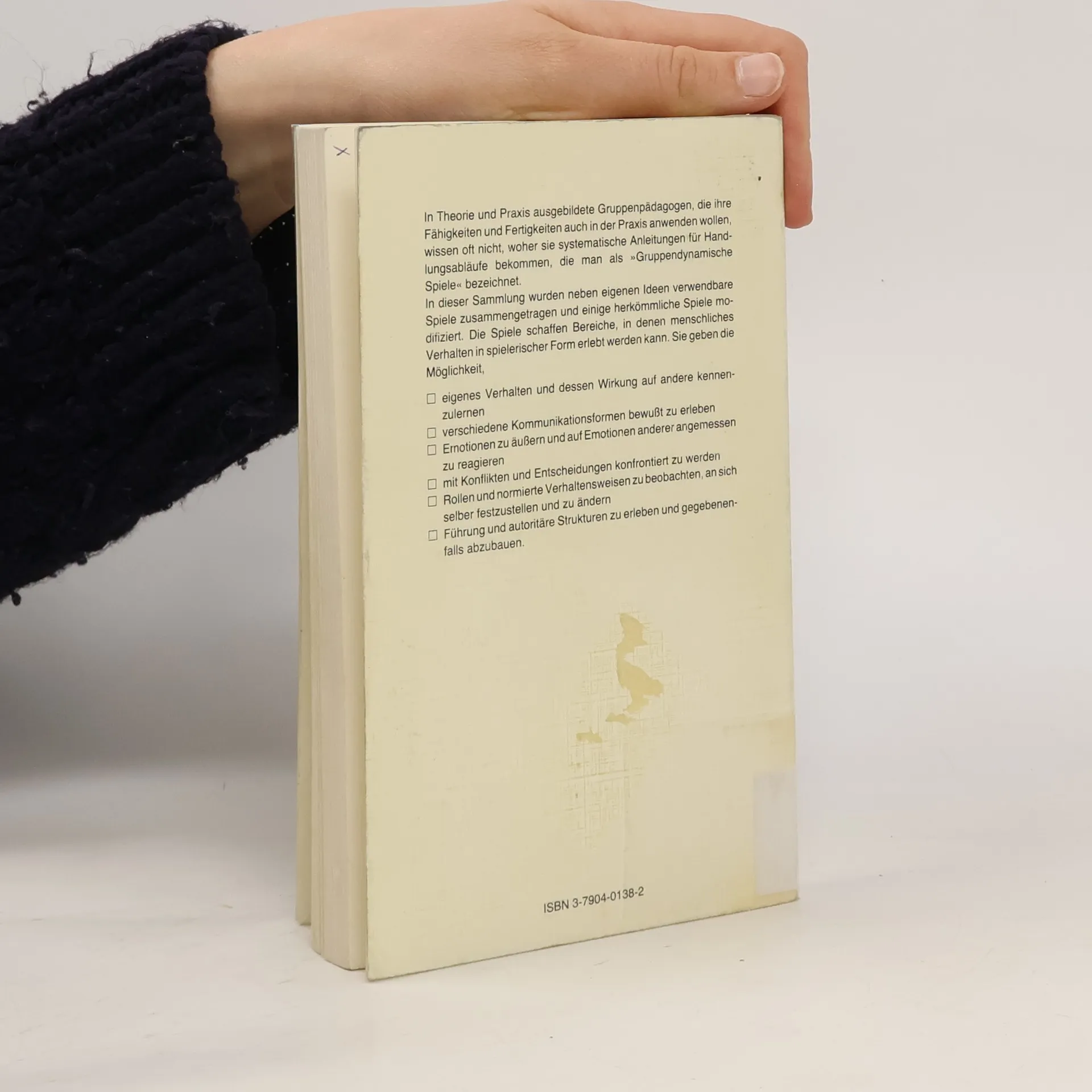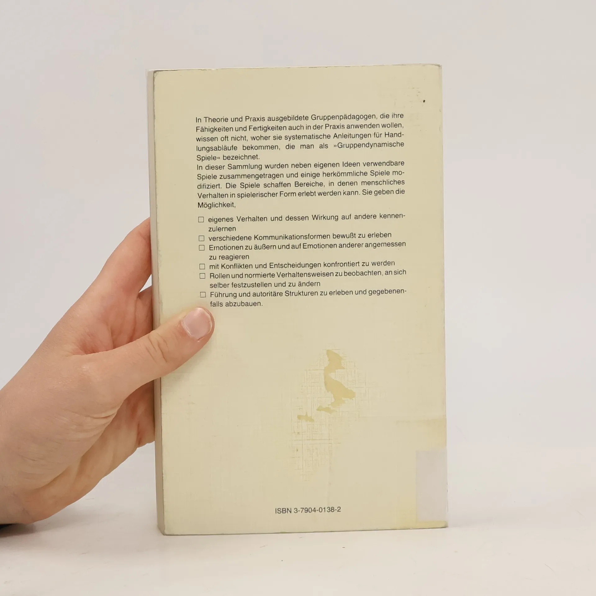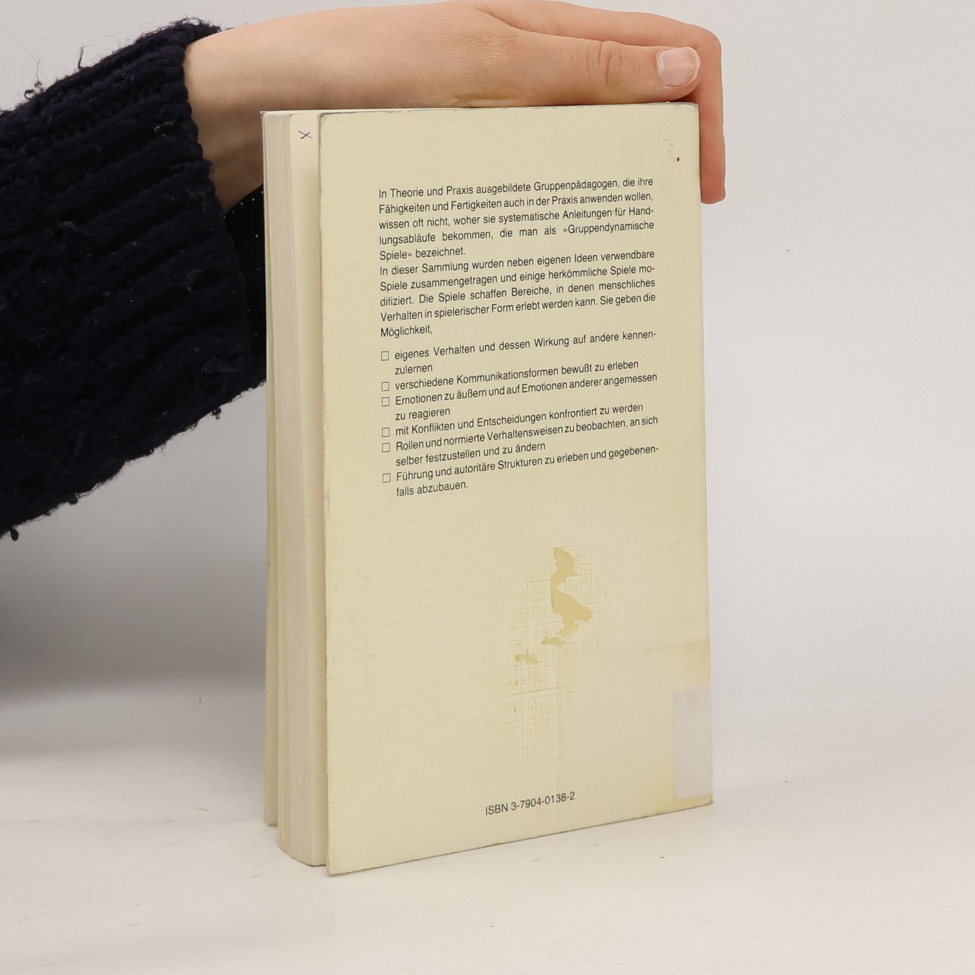 Sammlung gruppendynamischer Spiele zu folgenden Themenbereichen: Vorstellung und Kennenlernen, Kommunikation und Gruppenbildung, Beobachtung und Wahrnehmung, Identifikation und Einfühlung, Aggression und Durchsetzung.