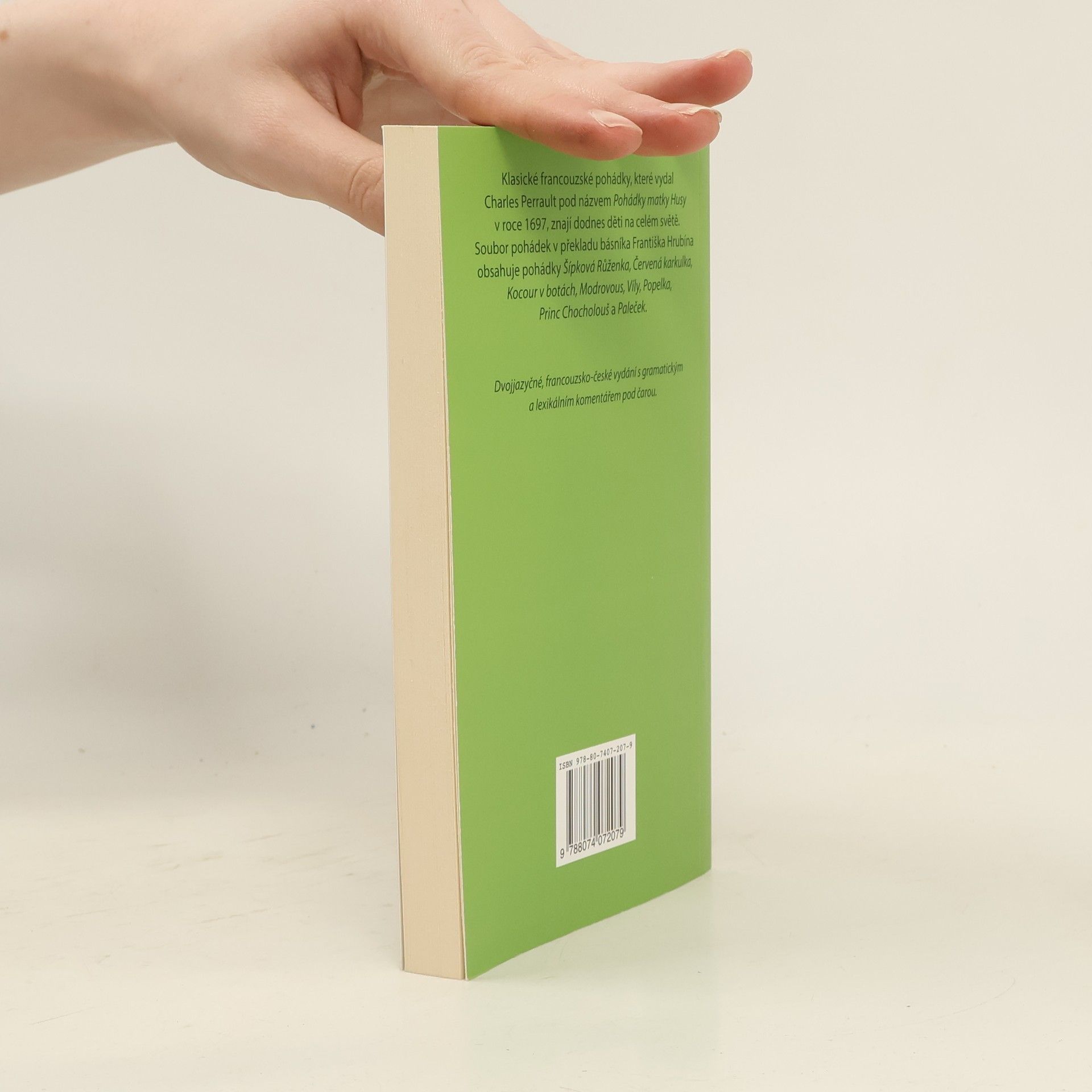 Jazyková úroveň - mírně pokročilí Klasické francouzské pohádky vydal Charles Perrault pod názvem Pohádky matky Husy v roce 1697. Dnes znají Červenou karkulku či Palečka děti na celém světě. V dvojjazyčném vydání nyní vychází soubor v překladu básníka Františka Hrubína, který obsahuje pohádky Šípková Růženka, Červená karkulka, Kocour v botách, Modrovous, Víly, Popelka, Princ Chocholouš a Paleček. Dvojjazyčné vydání s gramatickým a lexikálním komentářem pod čarou. Pro mírně pokročilé.