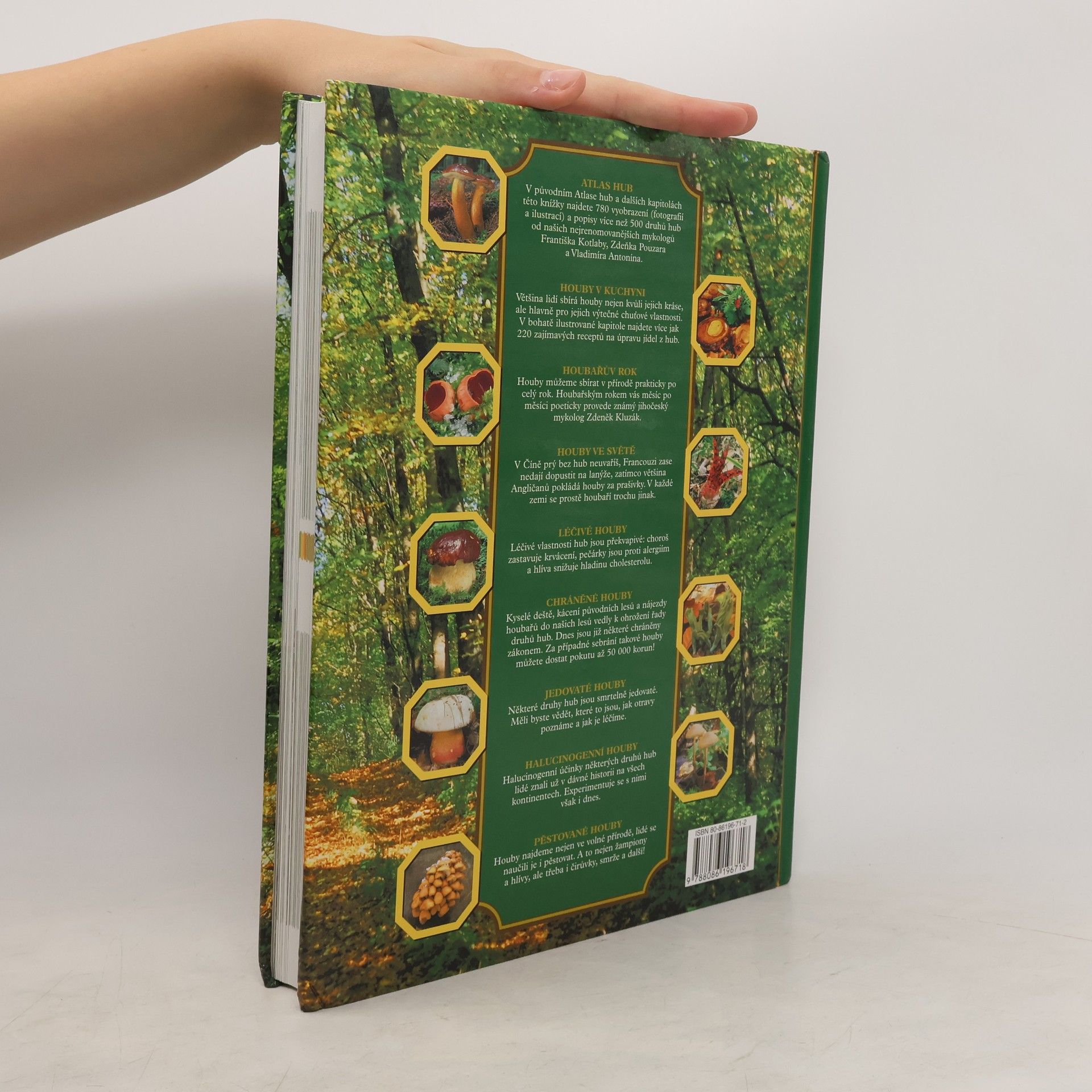 Popisy hub v této encyklopedii napsali naši přední mykologové. Najdete zde rovněž recepty na pokrmy z hub a houbařův kalendář, tedy doporučení jaké houby v daném ročním období sbírat. Vhodným doplňkem této knihy je přiložený Kapesní atlas hub, v němž naleznete vyobrazení a popisy nejznámějších druhů a jejich jedlých či jedovatých dvojníků, takže již přímo v lese budete moci houby snadno určit. schovat popis