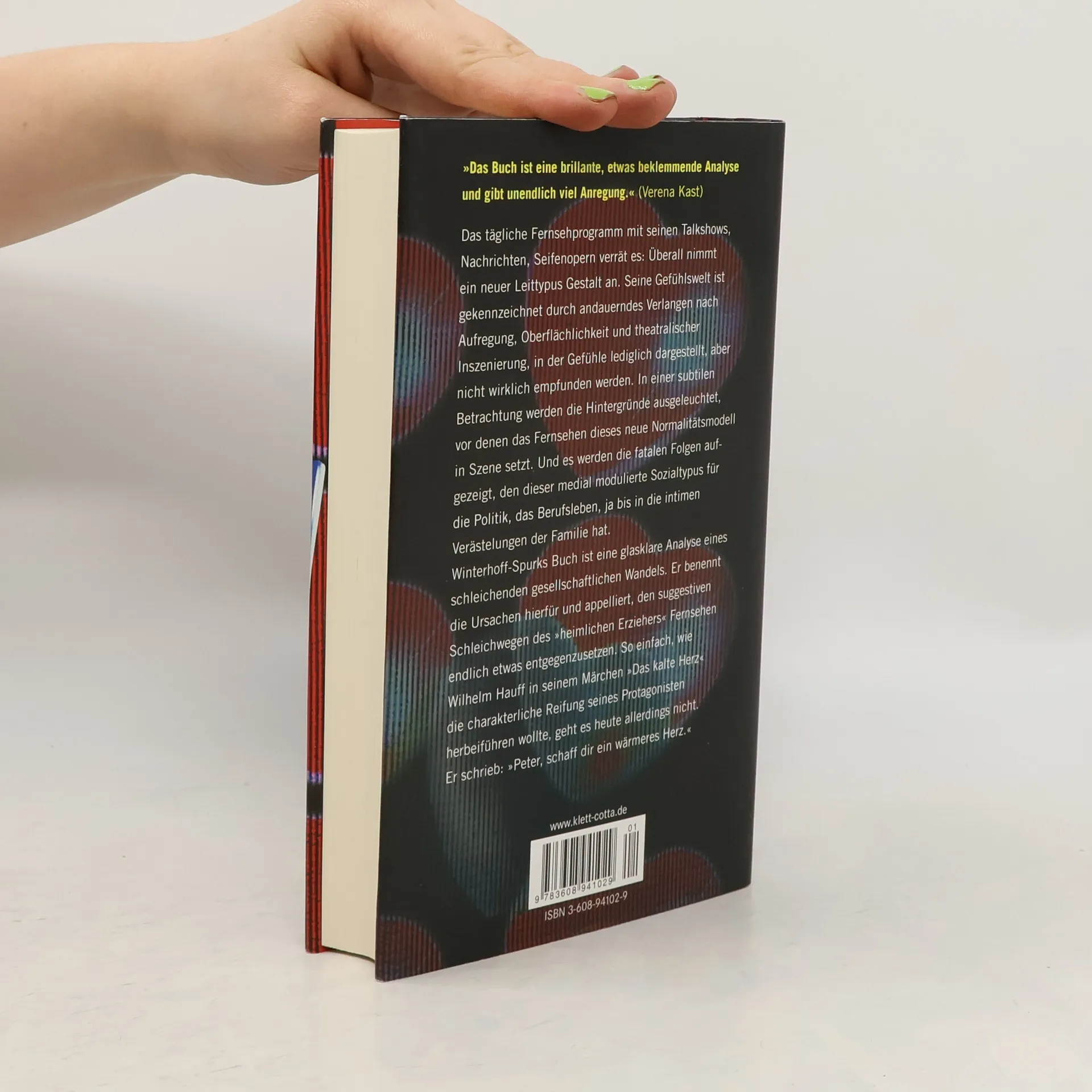 Das tägliche Fernsehprogramm mit seinen Talkshows, Nachrichten, Seifenopern verrät es: Überall nimmt ein neuer Leittypus Gestalt an. Seine Gefühlswelt ist gekennzeichnet durch andauerndes Verlangen nach Aufregung, Oberflächlichkeit und theatralischer Inszenierung, in der Gefühle lediglich dargestellt, aber nicht wirklich empfunden werden. In einer subtilen Betrachtung werden die Hintergründe ausgeleuchtet, vor denen das Fernsehen dieses neue Normalitätsmodell in Szene setzt. Und es werden die fatalen Folgen aufgezeigt, den dieser medial modulierte Sozialtypus für die Politik, das Berufsleben, ja bis in die intimen Verästelungen der Familie hat. CCRRWinterhoff-Spurk benennt die Ursachen für den gesellschaftlichen Wandel und appelliert, den suggestiven Schleichwegen des heimlichen Erziehers Fernsehen endlich etwas entgegenzusetzen.