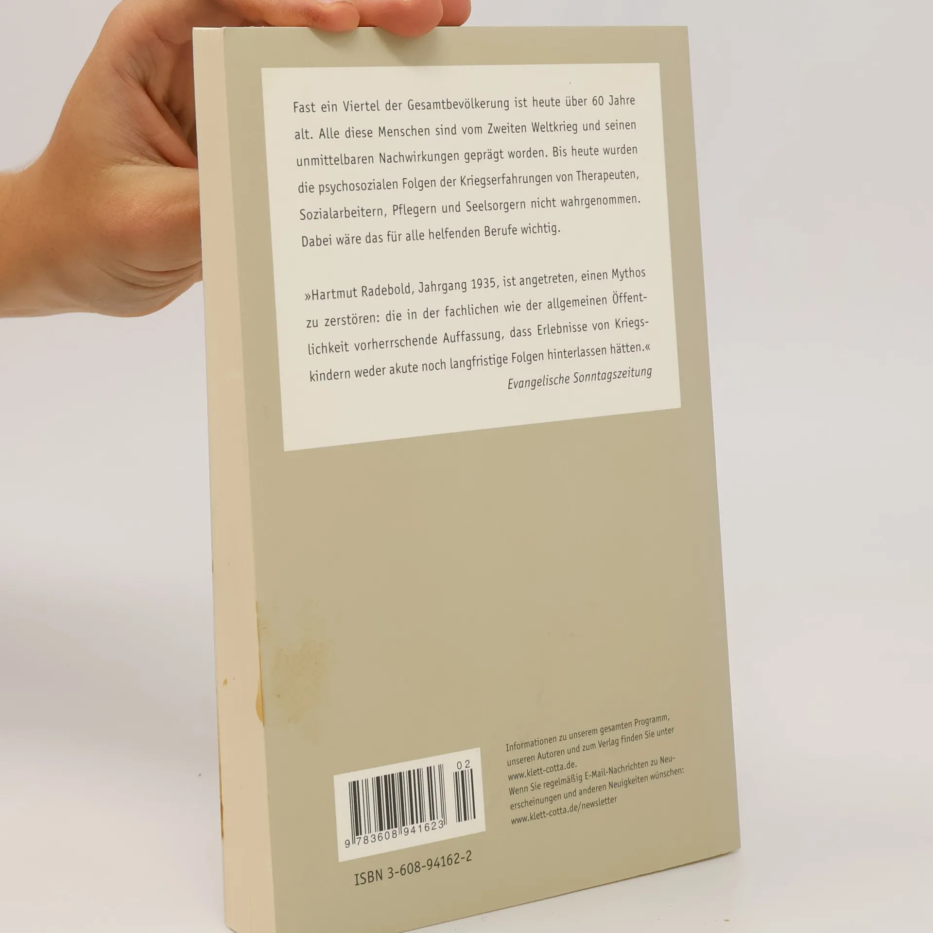 Wir wissen heute, daß die Erfahrungen der älteren Jahrgänge im Zweiten Weltkrieg gerade im Alter wieder hochkommen. Zwar dürfen Erlebnisse wie Ausbombung oder Vertreibung nicht automatisch mit Traumatisierung gleichgesetzt werden; unbestreitbar ist jedoch, daß diese Generation typische Verhaltensweisen entwickelt hat, die in der Kriegs- und Nachkriegszeit vorteilhaft waren: Was uns nicht umbringt, macht uns nur härter. Diese erweisen sich im Alter jedoch als problematisch, etwa dann, wenn die Älteren nicht sorgsam mit sich selbst umgehen, körperliche Belastungen ignorieren und Krankheiten nicht auskurieren. Die professionell Tätigen begegnen den Betroffenen in ihren Praxen, Institutionen, Kliniken und Altenpflegeeinrichtungen. Häufig wird dabei die Kriegsvergangenheit überhaupt nicht thematisiert. Dabei würden die Betroffenen gerne über ihre Vergangenheit reden. Aber wie, wenn ihre Signale nicht verstanden werden? Der Psychoanalytiker und Altersforscher Radebold zeigt, wie es möglich ist, frühere Lebenserfahrungen in beratenden und therapeutischen Gesprächen zu berücksichtigen. Dadurch wird deutlich, wie Hilfe geleistet, Entlastung gegeben und Stabilität bewirkt werden kann. Vgl. zum Thema: Sabine Bode: Die vergessene Generation. Die Kriegskinder brechen ihr Schweigen Mit einem Nachwort von Luise Reddemann