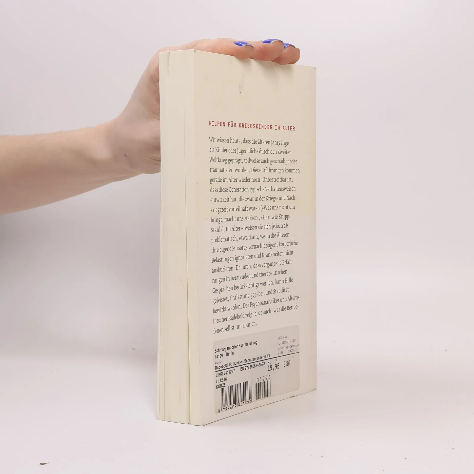 Wir wissen heute, dass die älteren Jahrgänge als Kriegskinder oder -teilnehmer durch den Zweiten Weltkrieg geprägt wurden und dass diese Erfahrungen gerade im Alter wieder hochkommen. Unbestreitbar ist, dass diese Generation typische Verhaltensweisen entwickelt hat, die zwar in der Kriegs- und Nachkriegszeit vorteilhaft waren (»Was uns nicht umbringt, macht uns stärker«, »Hart wie Krupp-Stahl«). Im Alter erweisen sie sich jedoch als problematisch, etwa dann, wenn die Älteren ihre eigene Fürsorge vernachlässigen, körperliche Belastungen ignorieren und Krankheiten nicht auskurieren. Dadurch, dass vergangene Erfahrungen in beratenden und therapeutischen Gesprächen berücksichtigt werden, kann Hilfe geleistet, Entlastung gegeben und Stabilität bewirkt werden. Der Psychoanalytiker und Alternsforscher Radebold zeigt aber auch, was die Betroffenen selbst dazu beitragen können.