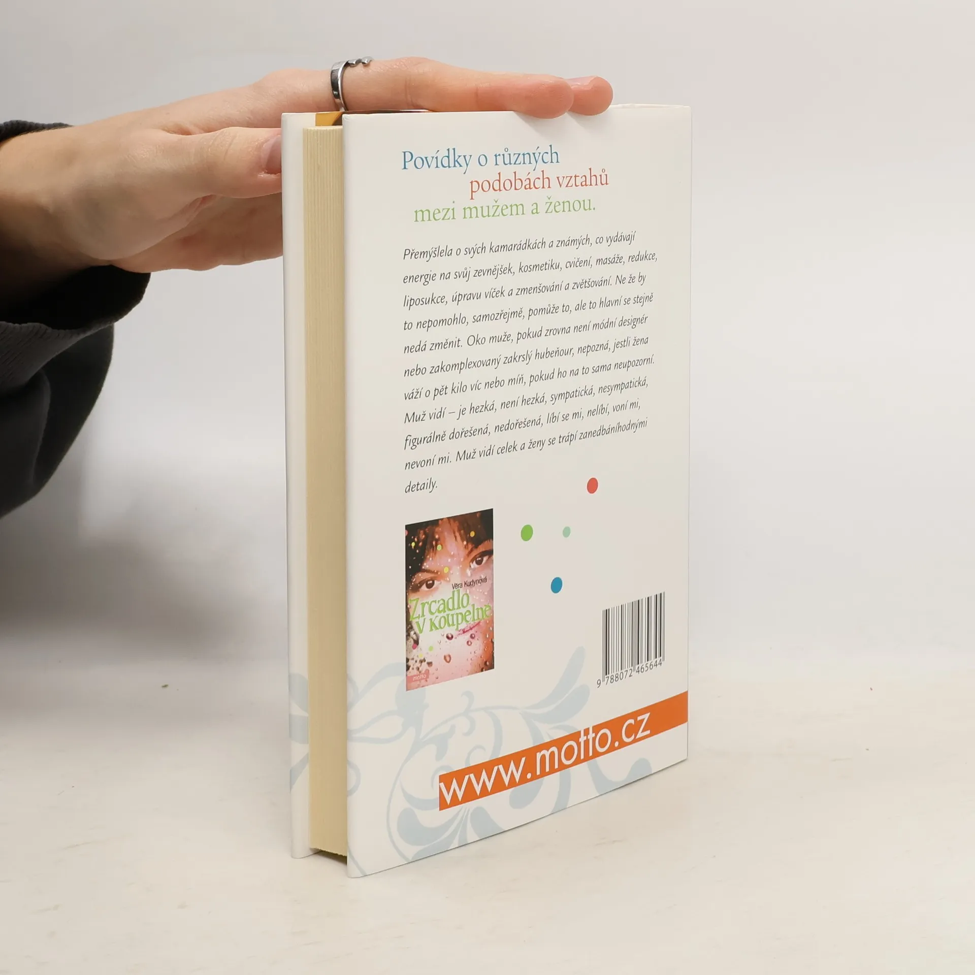 Povídky o různých podobách vztahů mezi mužem a ženou Přemýšlela o svých kamarádkách a známých, co vydávají energie na svůj zevnějšek, kosmetiku, cvičení, masáže, redukce, liposukce, řezání víček a zmenšování a zvětšování. Ne že by to nepomohlo, samozřejmě, pomůže to, ale to hlavní se stejně nedá změnit. Oko muže, pokud zrovna není módní designer nebo zakomplexovaný zakrslý hubeňour, nepozná, jestli žena váží o pět kilo víc nebo míň, pokud ho na to sama neupozorní. Muž vidí – je hezká, není hezká, sympatická, nesympatická, figurálně dořešená, nedořešená, líbí se mi, nelíbí, voní mi, nevoní mi. Muž vidí celek a ženy se trápí zanedbáníhodnými detaily...