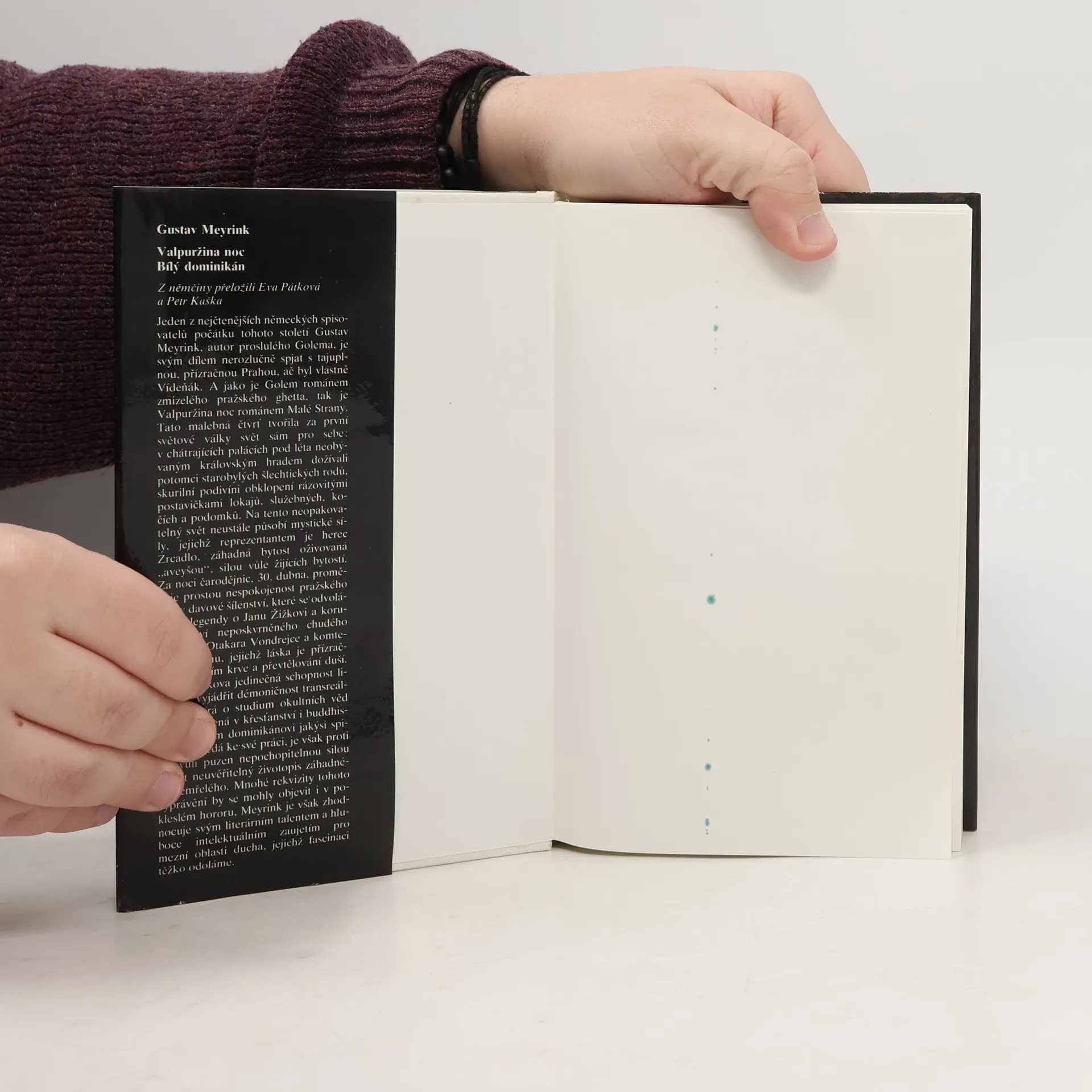 Souborné vydání dvou románů. Román se odehrává na Malé Straně za Valpuržiny noci, noci čarodějnic. – V románu „Bílý dominikán" usedá jakýsi spisovatel ke své práci, je však proti své vůli puzen nepochopitelnou silou sepsat neuvěřitelný životopis záhadného zemřelého.