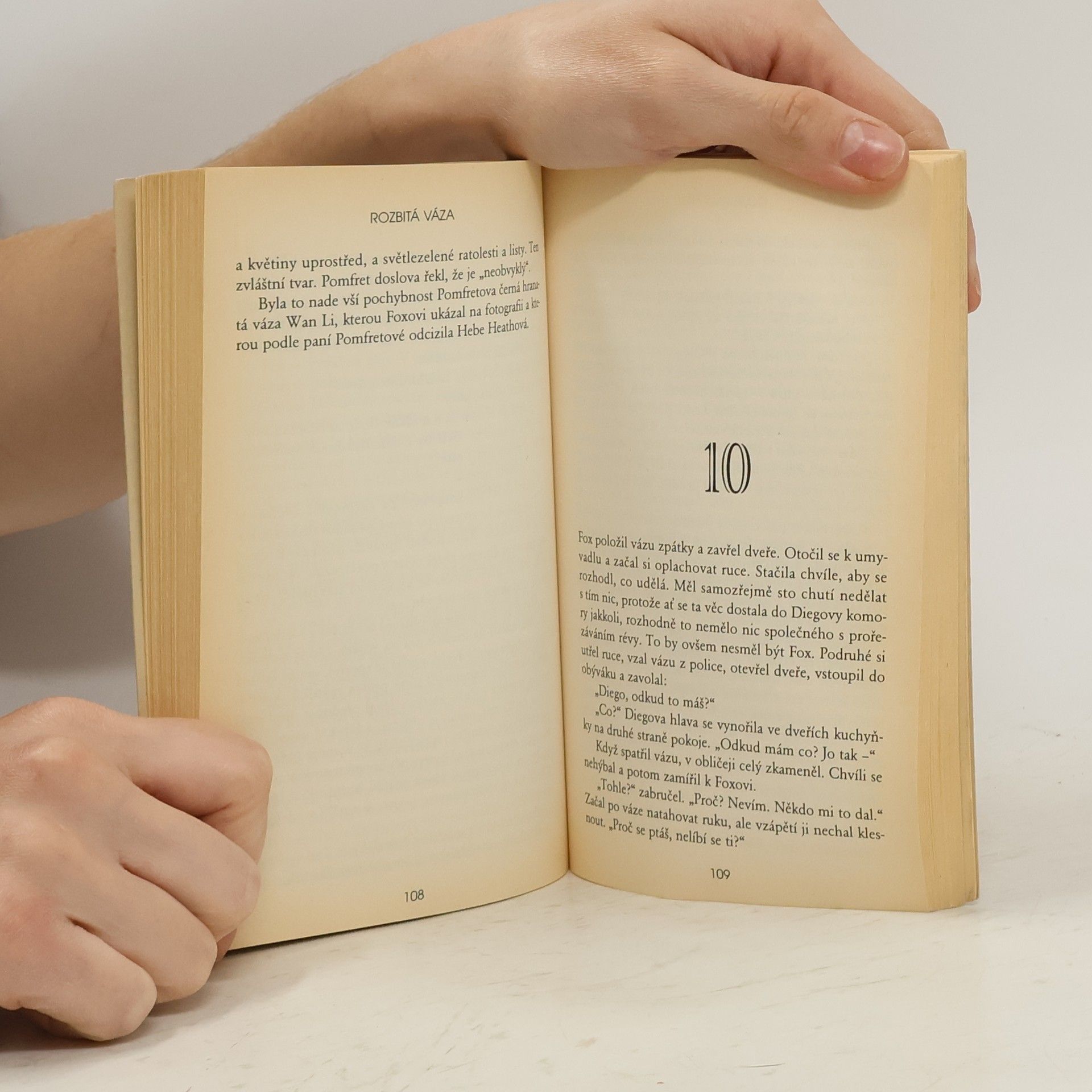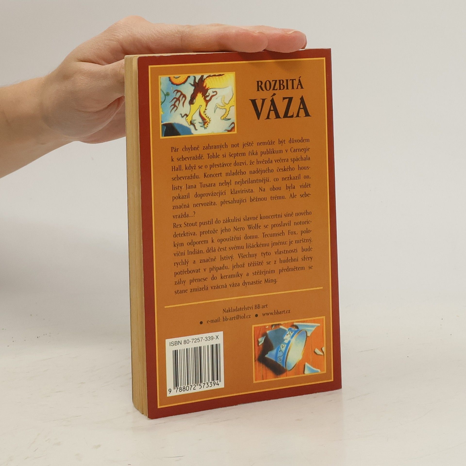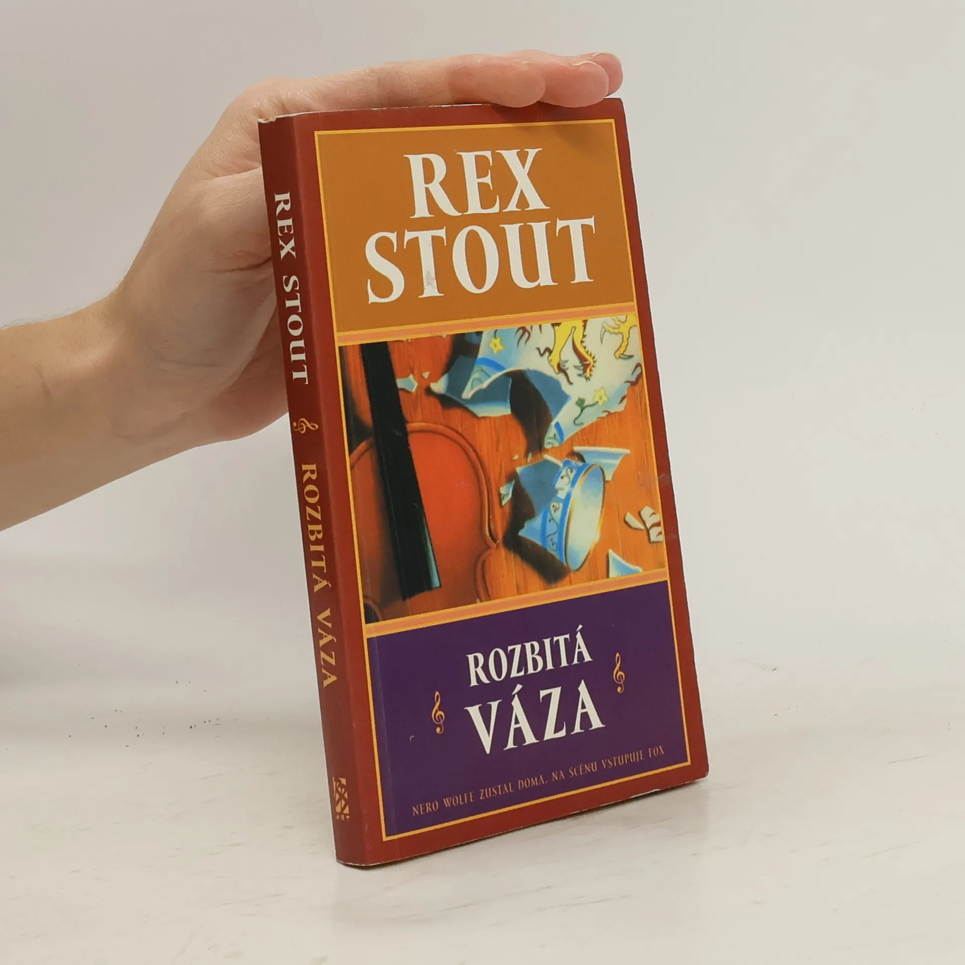 Podtitul: „Tentokrát Detektiv Tecumseh Fox“. Roztříštěná čínská váza z 16.století a poškozené vzácné housle jsou jedinými vodítky detektiva Foxe k odhalení chladnokrevného vraha s vášní pro umění. Z anglického originálu „The Broken Vase“ (First published in the United states of America in 1941 by Farrar Rinehart) přeložil © Michal Strenk. Grafická úprava obálky Jan Matoška, Robin Brichta s použitím původní ilustrace ©1986 Bantam Books, Inc. Lesklé tvrdé laminované desky.