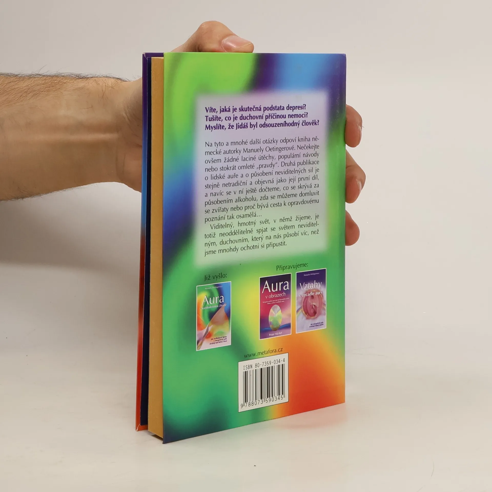 Víte, jaká je skutečná podstata depresí? Tušíte, co je duchovní příčinou nemoci? Myslíte, že Jidáš byl odsouzeníhodný člověk? Na tyto a mnohé další otázky odpoví kniha německé autorky Manuely Oetingerové. Nečekejte ovšem žádné laciné útěchy, populární návody nebo stokrát omleté „pravdy“. Druhá publikace o lidské auře a o působení neviditelných sil je stejně netradiční a objevná jako její první díl, a navíc se v ní ještě dočteme, co se skrývá za působením alkoholu, zda se můžeme domluvit se zvířaty nebo proč bývá cesta k opravdovému poznání tak osamělá… Viditelný, hmotný svět, v němž žijeme, je totiž neoddělitelně spjat se světem neviditelným, duchovním, který na nás působí víc, než jsme mnohdy ochotni si připustit.