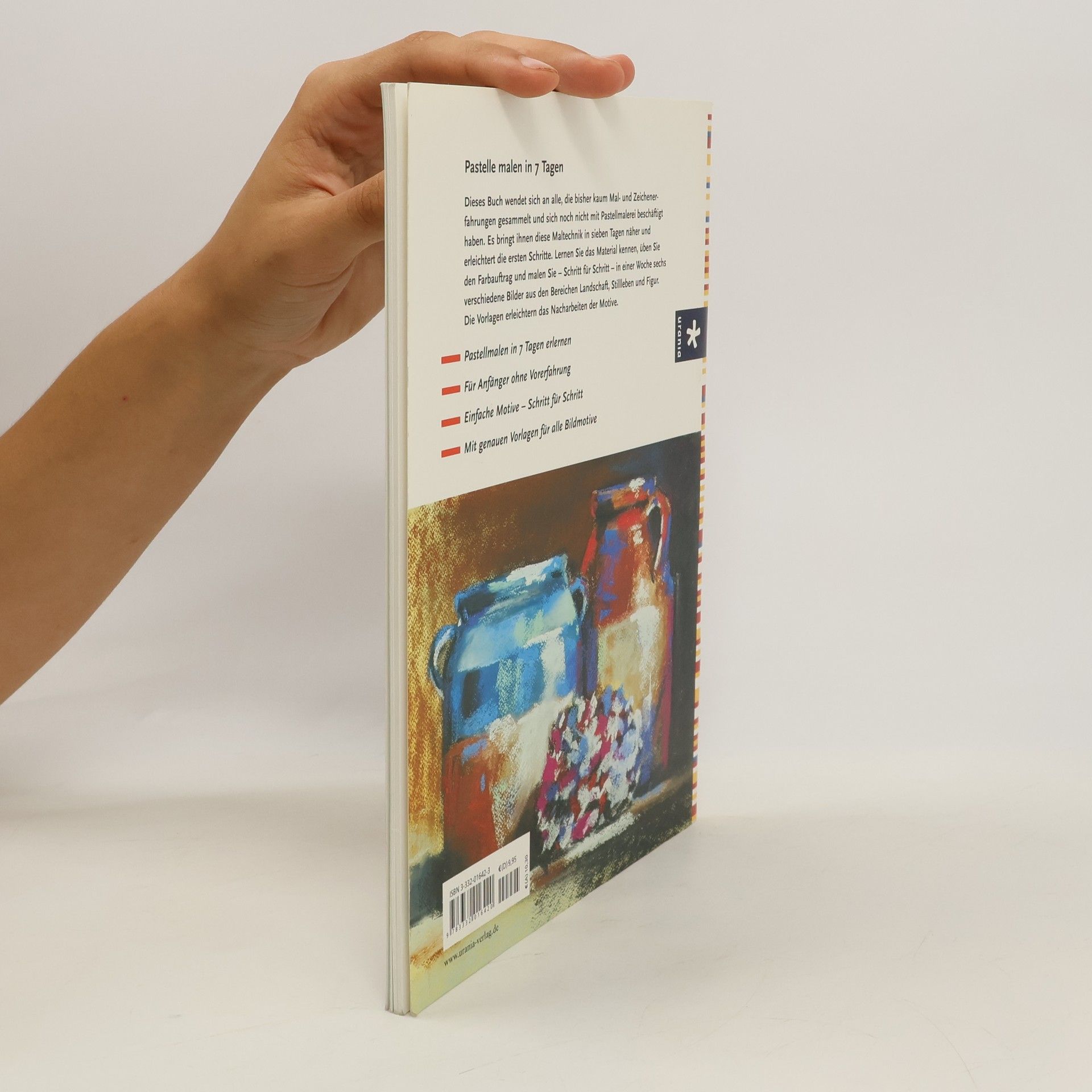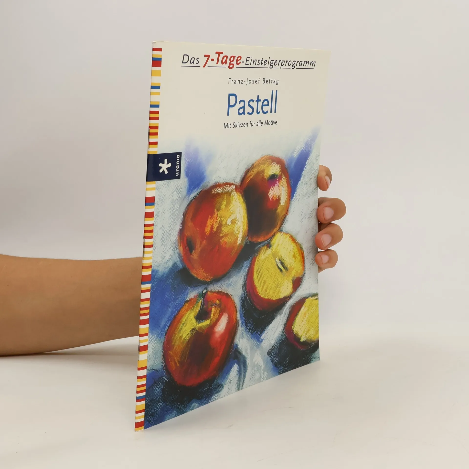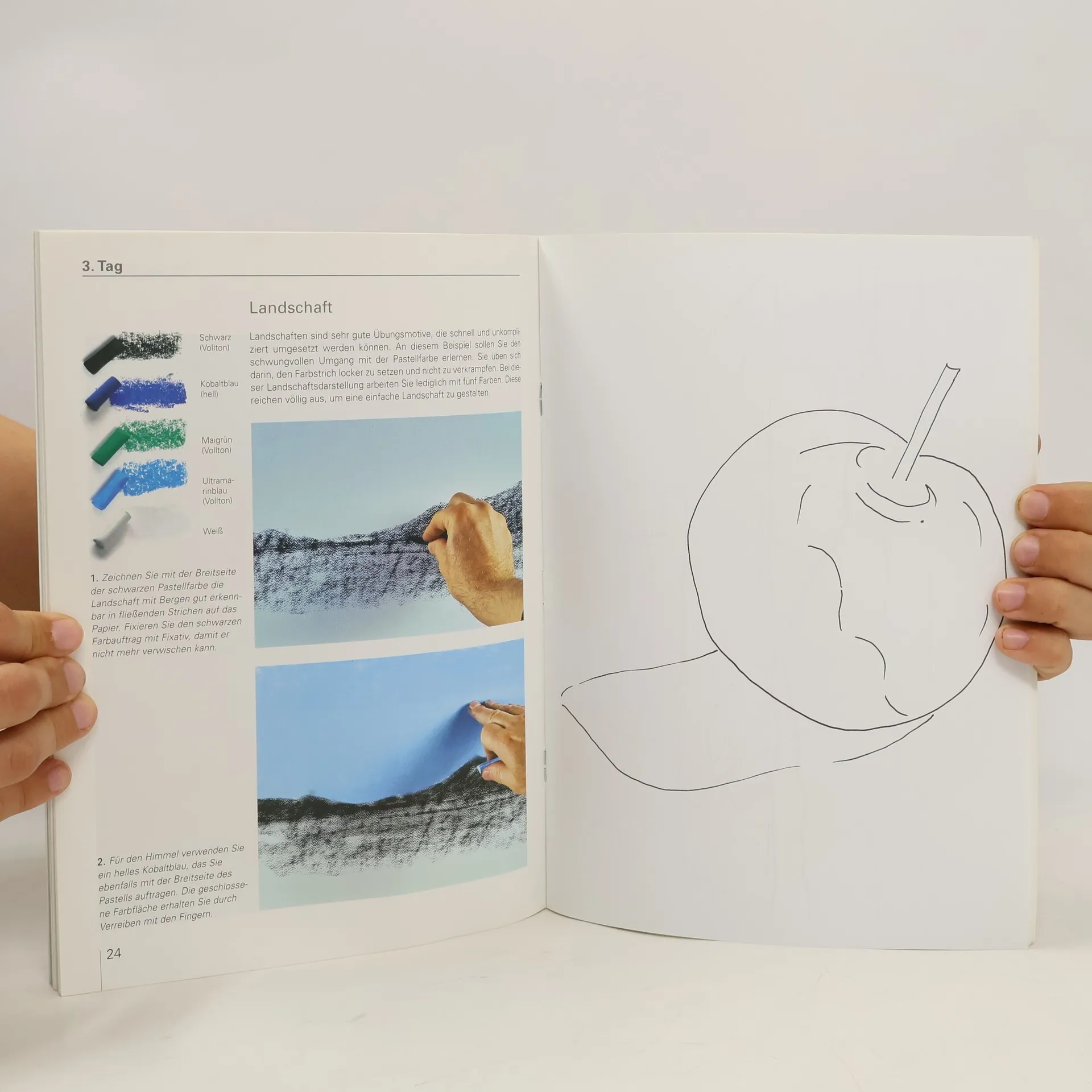 1. Tag: Kennenlernen der Farben, Malgründe, Werkzeug und erstes Ausprobieren. 2. Tag: Erste Farbwahl mit 6 Farben, Setzen von Licht und Schatten. 3. Tag: Zweite Farbwahl mit 12 Farben, Vergleichen von Tonwerten. 4. Tag: Dritte Farbwahl 18 Farben, kalte und warme Farben. 5. – 7. Tag: Weitere Motive (Vorlagenskizzen eingeheftet), die das Wissen über Anwendung von Pastellen weiter aufbauen.