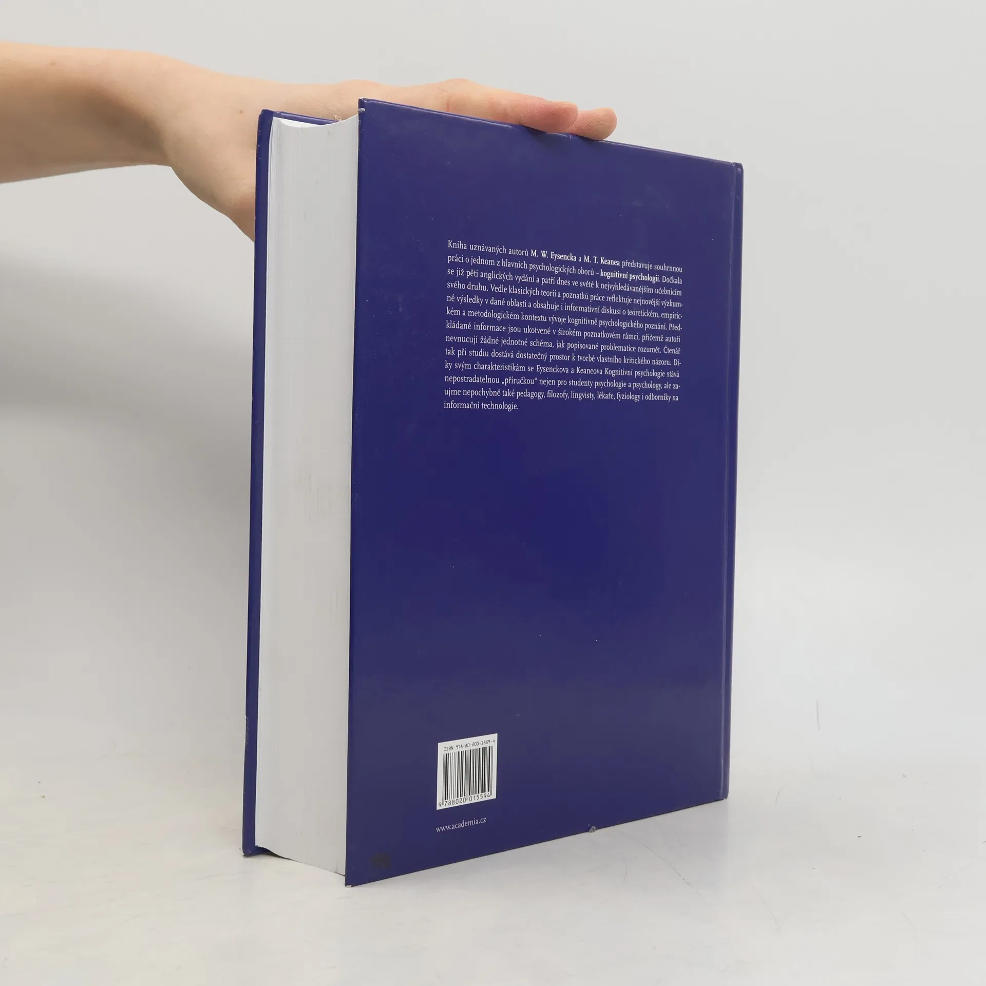 Kniha světově uznávaných autorů představuje souhrnnou práci o jednom z nejširších a nejvýznamnějších psychologických oborů – kognitivní psychologii – a je určena především ke studiu. Práce reflektuje nejnovější výzkumné výsledky v této oblasti a obsahuje i informativní diskusi o teoretickém, empirickém a metodologickém kontextu vývoje kognitivní psychologie. Prezentuje jak základy kognitivní psychologie, tak všechny významné teorie, přístupy, metody a poznatky. Ty jsou vysvětleny, hodnoceny a shrnuty tak, aby si čtenář mohl vytvořit i vlastní kritický názor. Díky těmto charakteristikám je Eysenckova a Keanova Kognitivní psychologie, která vyšla anglicky již v pěti vydáních, „příručkou“ takového druhu, že ji čtenáři budou chtít mít stále „po ruce“. Text je navíc doplněn množstvím názorných obrázků a grafů. Kromě studentů psychologie a psychologů zaujme publikace nepochybě i pedagogy, lékaře, lingvisty, fyziology a odborníky na informační technologie.