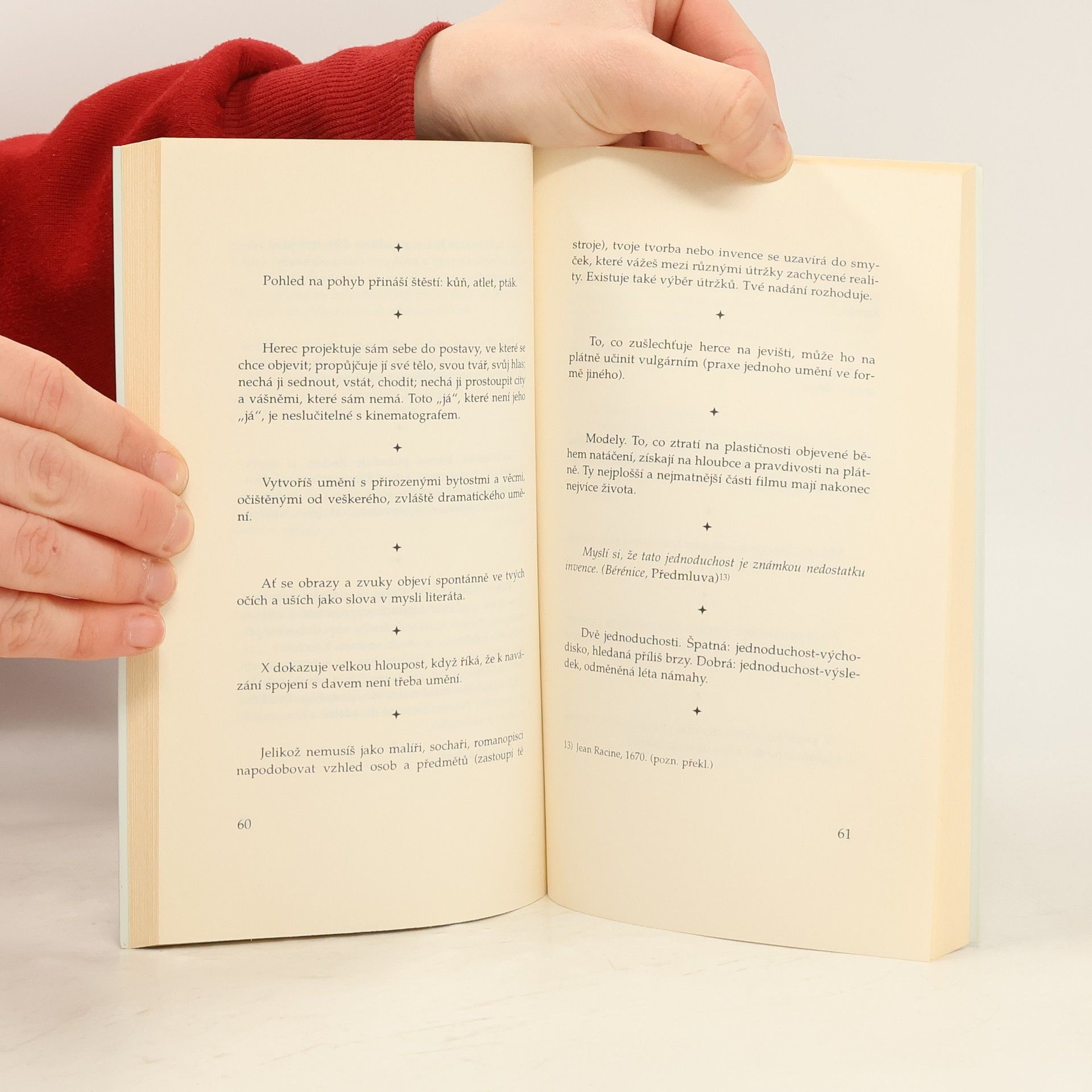 Kniha postřehů, formulovaných s tvarovou dokonalostí aforismů, francouzského filmového režiséra, jehož dílo je výrazně individuální a nenapodobitelné a nelze je zařadit do žádného proudu či směru.