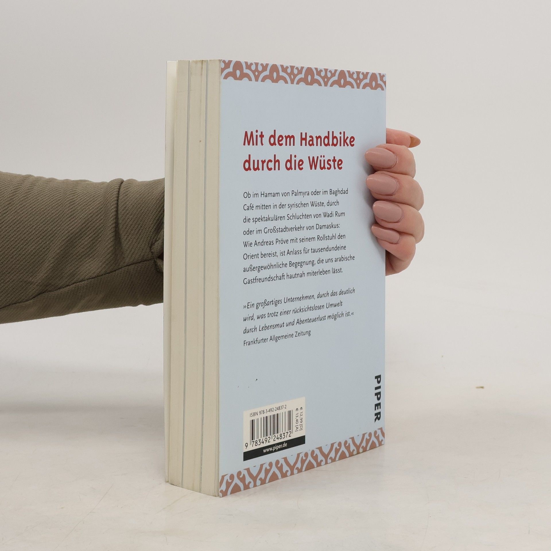 Ob im Hamam von Palmyra oder im Baghdad Café mitten in der syrischen Wüste, durch die spektakulären Schluchten von Petra und Wadi Rum, im Großstadtverkehr von Damaskus oder beim persischen Aschura-Fest: Wie Andreas Pröve mit seinem Rollstuhl den Orient bereist, ist Anlass für tausendundeine außergewöhnlich intensive Begegnung, die uns arabische Gastfreundschaft hautnah miterleben lässt.
