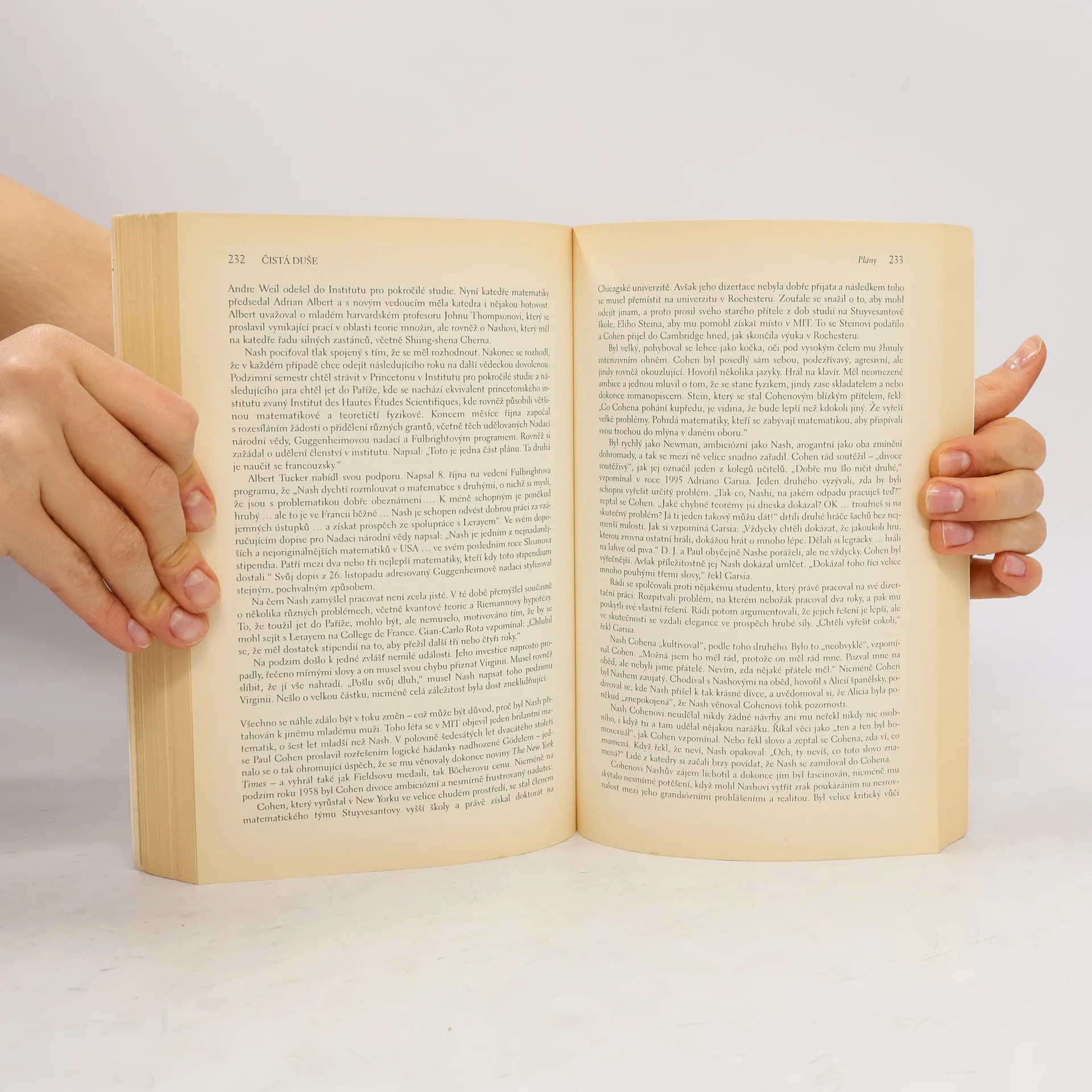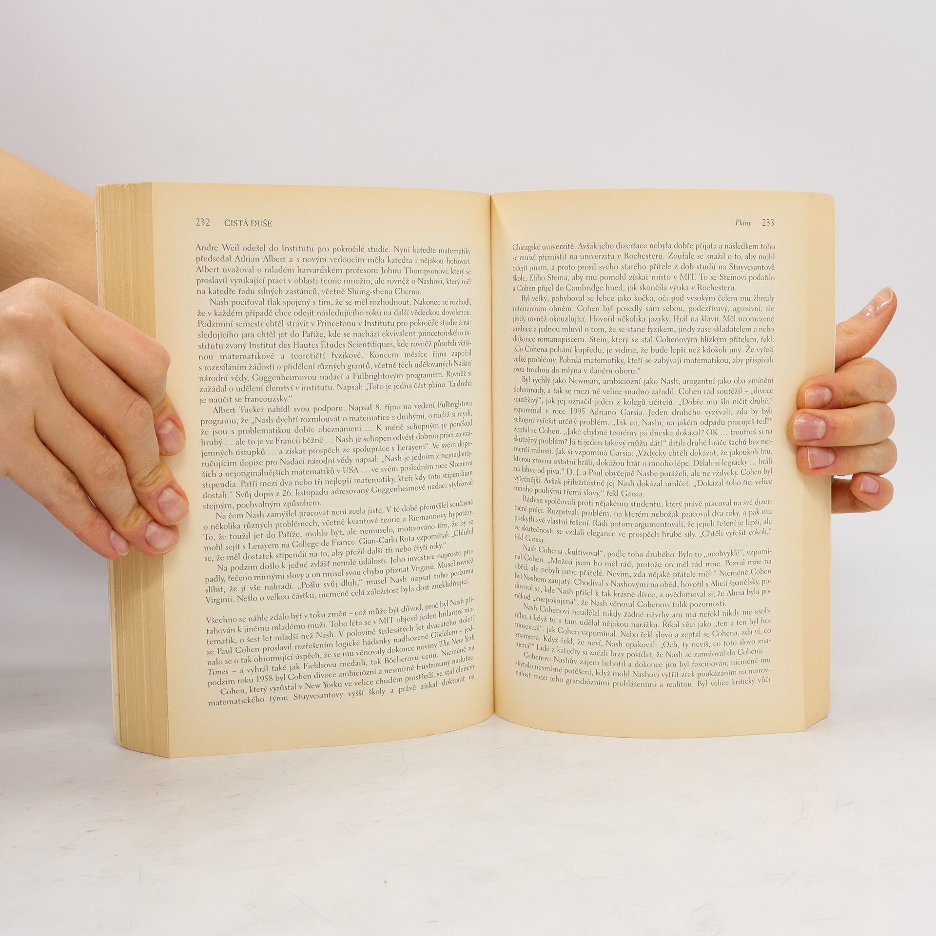 „Jak jsi mohl jako matematik věřit, že ti mimozemšťané posílají zprávy?“, zeptal se návštěvník z Harvardu rodáka ze Západní Virginie, který vypadal jako filmová hvězda se způsoby olympského boha. „Protože myšlenky, které mě napadaly o mimozemšťanech, ke mně přicházely stejným způsobem jako moje matematické myšlenky,“ odpověděl. „Tak jsem je bral vážně.“ Tak začíná pravdivý příběh Johna Nashe, matematického génia, který se už ve svých třiceti letech stal legendou. Postihla jej však duševní nemoc, o níž zprvu nevěděl, ale jež mu velmi ztrpčovala život. Díky obětavosti své krásné a laskyplné ženy a díky loajalitě matematické společnosti se z nemoci po desetiletích, během nichž přežíval jako přízrak, vyléčil. Nakonec se mu dostalo světového uznání a stal se nositelem Nobelovy ceny. Biografie autorky Sylvie Nasar představuje drama o tajemství lidské mysli, v němž vítězí láska navzdory nezměrné nepřízni osudu. Kniha se stala předlohou pro velmi úspěšný film Čistá duše.