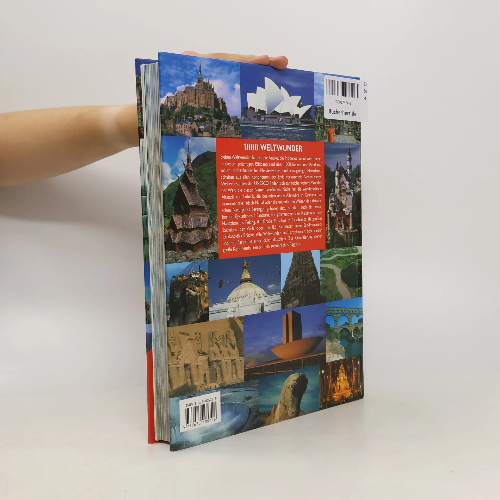 Sieben Weltwunder kannte die Antike, die Moderne kennt weit mehr: In diesem prächtigen Bildband sind über 1000 bedeutende Baudenkmäler, architektonische Meisterwerke und einzigartige Naturlandschaften aus allen Kontinenten der Erde versammelt. Neben vielen Welterbestätten der UNESCO finden sich zahlreiche weitere Wunder der Welt, die diesen Namen verdienen: Nicht nur die wunderschöne Altstadt von Lübeck, die beeindruckende Alhambra in Granada, das monumentale Tadsch Mahal oder die unendlichen Weiten des afrikanischen Naturparks Serengeti gehören dazu, sondern auch die bezaubernde Kykladeninsel Santorin, der jahrhundertealte Kaiserkanal von Hangzhou bis Peking, die Große Moschee in Casablanca als größter Sakralbau der Welt oder die 8,3 Kilometer lange San-Francisco-Oakland-Bay-Brücke. Alle Weltwunder sind anschaulich beschrieben und mit Farbfotos eindrücklich illustriert. Zur Orientierung dienen große Kontinentalkarten und ein ausführliches Register.