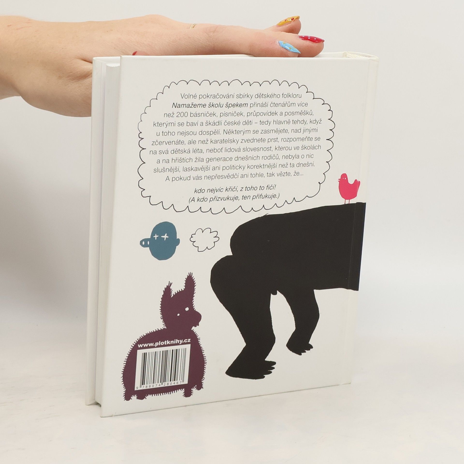Volné pokračování sbírky dětského folkloru Namažeme školu špekem přináší čtenářům více než 200 básniček, písniček, průpovídek a posměšků, kterými se baví a škádlí české děti – tedy hlavně tehdy, když u toho nejsou dospělí. Některým se zasmějete, nad jinými zčervenáte, ale než karatelsky zvednete prst, rozpomeňte se na svá dětská léta, neboť lidová slovesnost, kterou ve školách a na hřištích žila generace dnešních rodičů, nebyla o nic slušnější, laskavější ani politicky korektnější než ta dnešní. A pokud vás nepřesvědčí ani tohle, tak vězte, že… kdo nejvíc křičí, z toho to fičí!