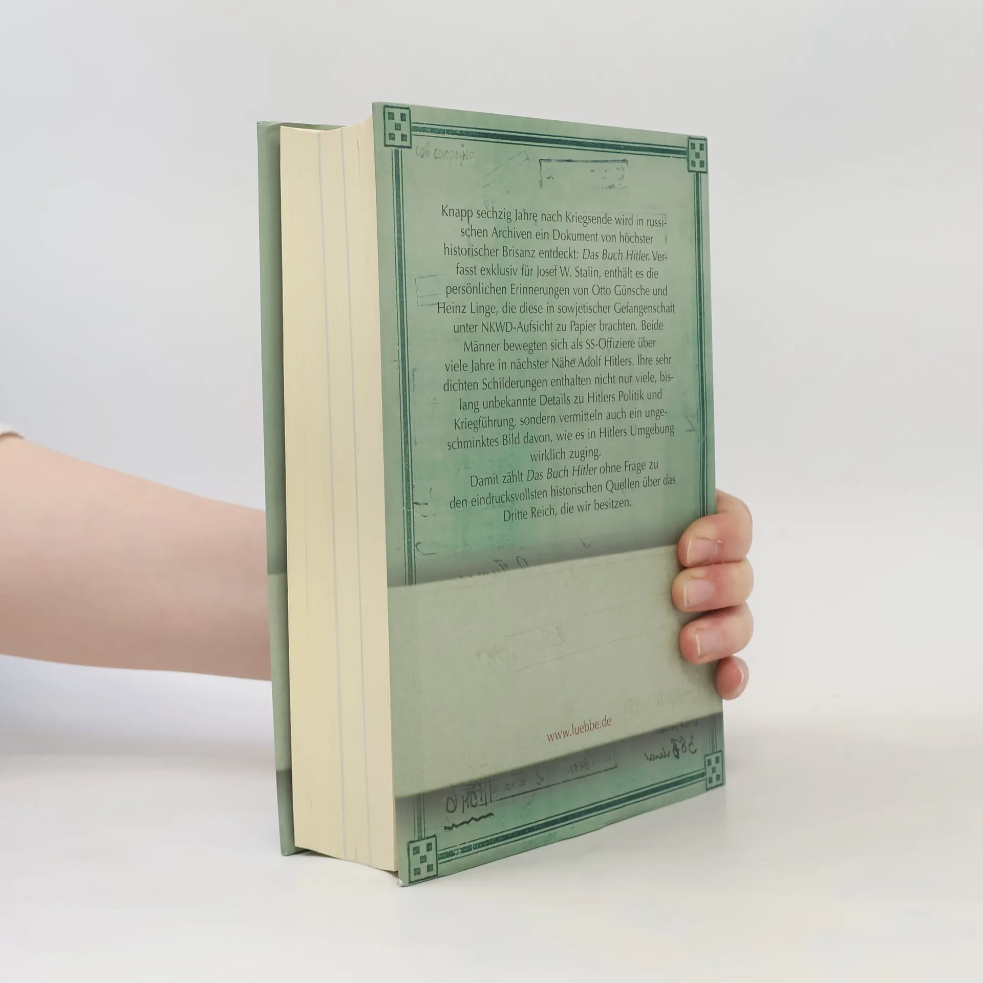 Knapp sechzig Jahre nach Kriegsende wird in russischen Archiven ein Dokument von höchster historischer Brisanz entdeckt: Das Buch Hitler. Verfasst exklusiv für Josef W. Stalin, enthält es die persönlichen Erinnerungen von Otto Günsche und Heinz Linge, die diese in sowjetischer Gefangenschaft unter NKWD-Aufsicht zu Papier brachten. Beide Männer bewegten sich als SS-Offiziere über viele Jahre in nächster Nähe Adolf Hitlers. Ihre sehr dichten Schilderungen enthalten nicht nur viele, bislang unbekannte Details zu Hitlers Politik und Kriegführung, sondern vermitteln auch ein ungeschminktes Bild davon, wie es in Hitlers Umgebung wirklich zuging. Eine der eindrucksvollsten historischen Quellen über das Dritte Reich!
