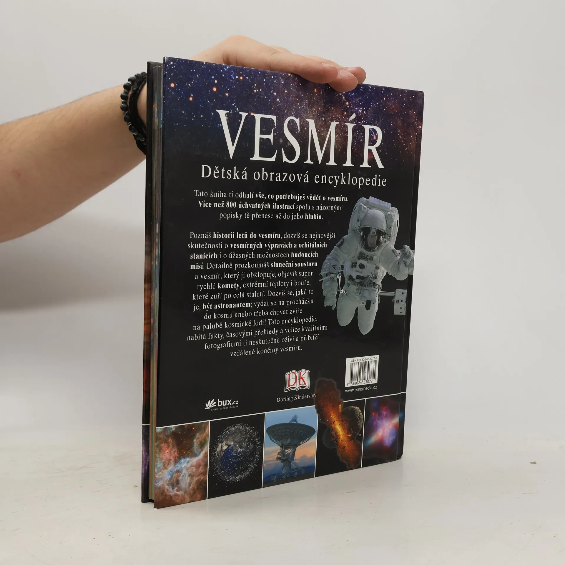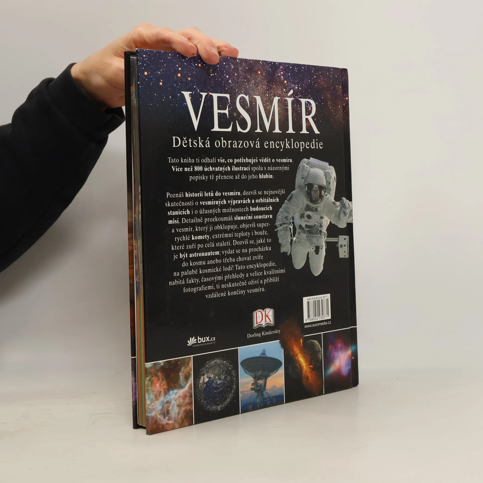 Dětská obrazová encykloppedie. Tato dětská obrazová encyklopedie určená pro děti od deseti let čtenářům odhalí vše, co se touží dozvědět o vesmíru. Více než 800 úchvatných ilustrací spolu s názornými popisky je přenese až do jeho hlubin. Poznají historii letů do vesmíru, dozvědí se nejnovější skutečnosti o vesmírných výpravách a orbitálních stanicích i o úžasných možnostech budoucích misí. Detailně prozkoumají sluneční soustavu a vesmír, který ji obklopuje, objeví super rychlé komety, extrémní teploty i bouře, které zuří po celá staletí. Dozvědí se, jaké to je, být astronautem; vydat se na procházku do kosmu anebo třeba chovat zvíře na palubě kosmické lodi!