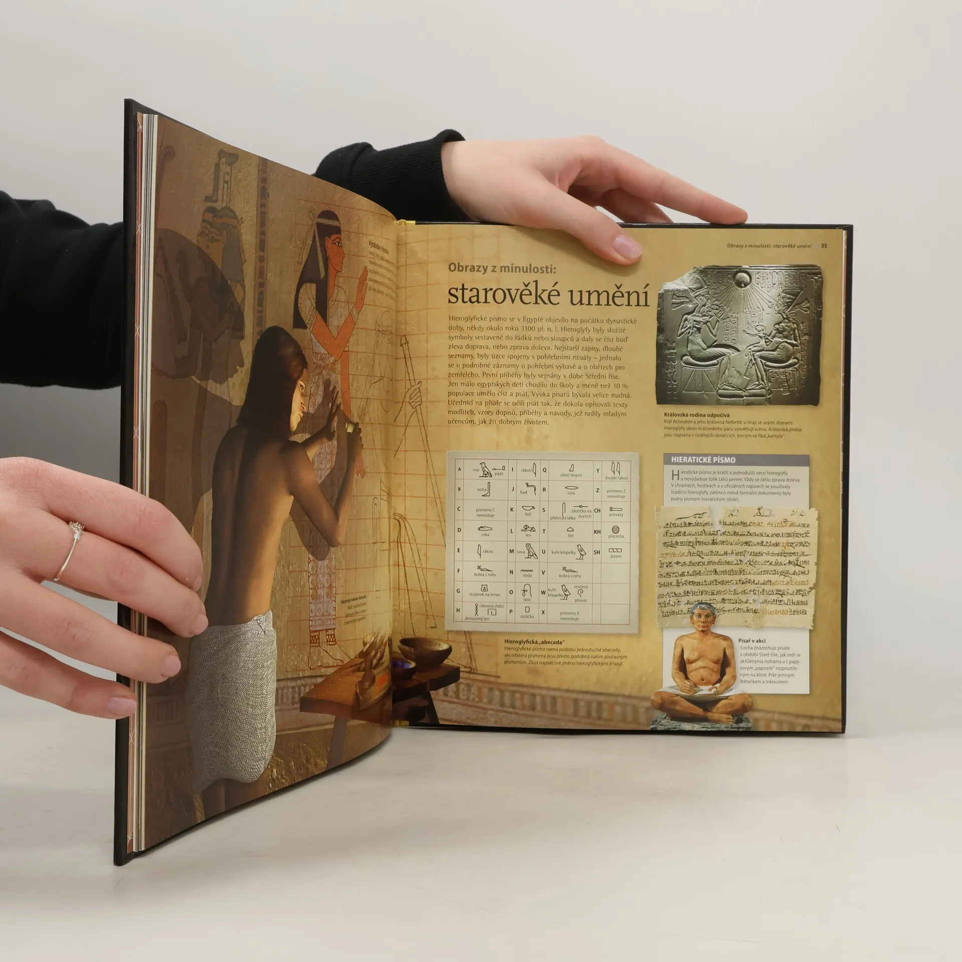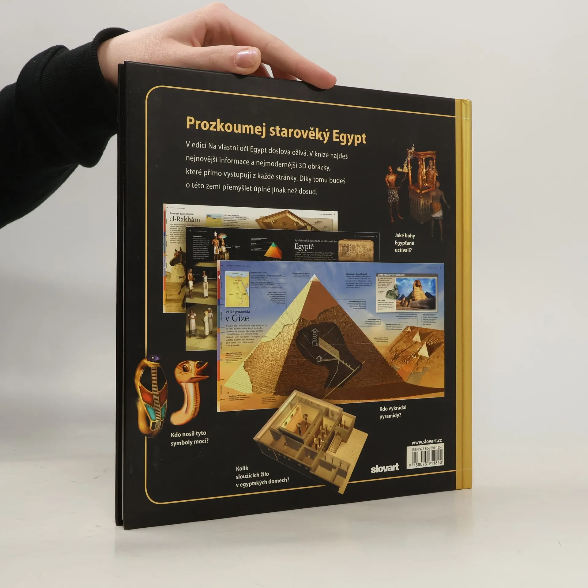 V edici s působivými ilustracemi, které dětského čtenáře svou trojrozměrností plně vtahují do obsahu jednotlivých kapitol, je jeden ze dvou nových titulů věnovaný starověkému Egyptu. Po úvodních informacích o základních historických faktech, chronologii, vykopávkách a rozluštění hieroglyfického písma přechází čtenář z jedné zajímavé kapitoly do druhé: panteon staroegyptských bohů a bohyň, stavby pyramid, mumifikování zemřelých, představy Egypťanů o posmrtném životě, obdělávání půdy, které souviselo se záplavami Nilu, obraz egyptské domácnosti, umění a řemesla, staroegyptská armáda, Údolí králů, dobrodružství Howarda Cartera při objevení Tutanchamonovy hrobky, chrámy v Abú Simbelu, chrámový komplex v Karnaku a mnoho dalšího.
