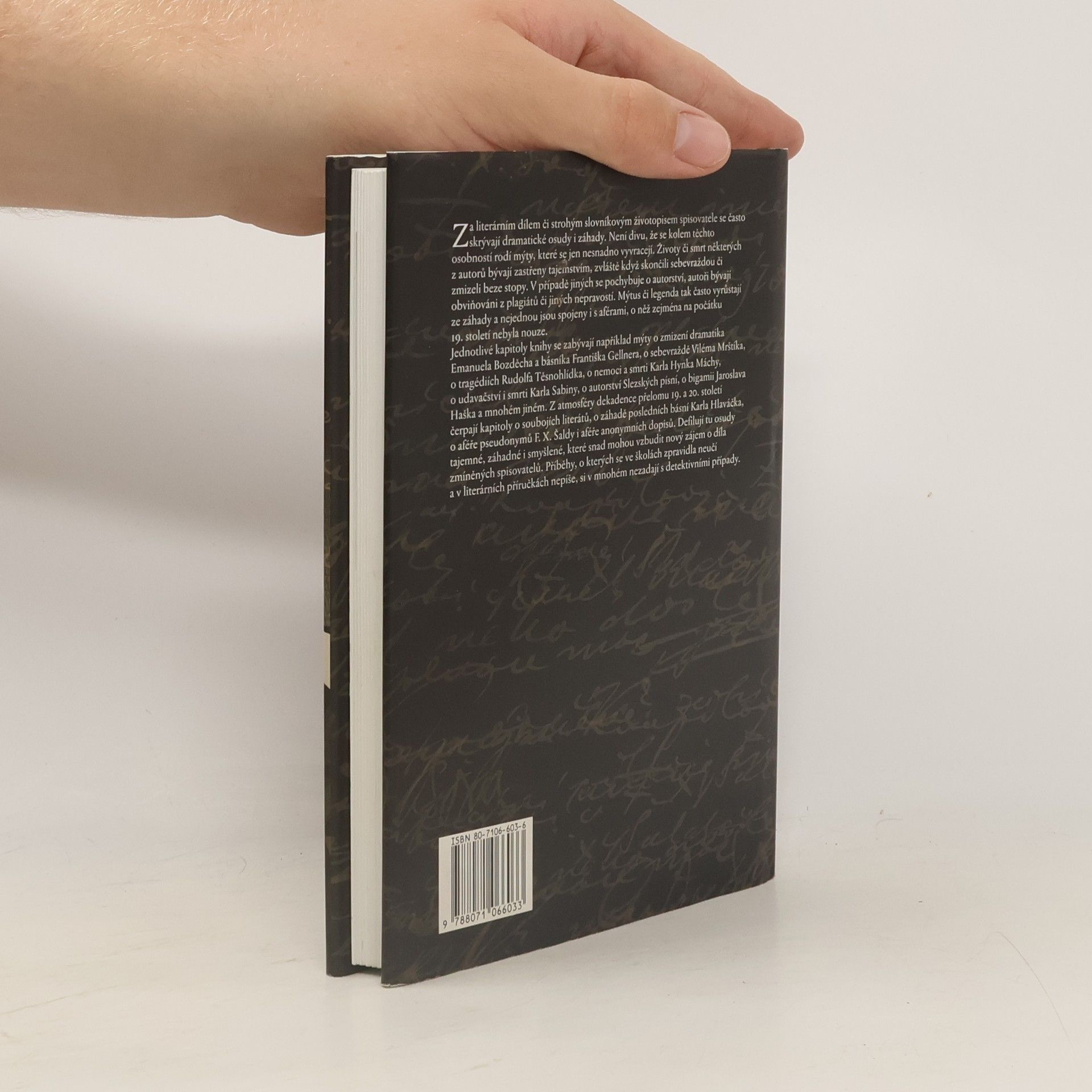 Otazníky nad životy a díly českých spisovatelů. Za literárním dílem či strohým slovníkovým životopisem spisovatele se často skrývají dramatické osudy i záhady. Není divu, že se kolem těchto osobností rodí mýty, které se nesnadno vyvracejí. Životy či smrt některých autorů bývají zastřeny tajemstvím, zvláště když skončili sebevraždou nebo zmizeli beze stopy. V případě jiných se pochybuje o autorství, autoři bývají obviňováni z plagiátů či jiných nepravostí. Defilují zde osudy tajemné, záhadné, smyšlené, které vzbuzují nový zájem o díla zmíněných spisovatelů. Příběhy, o kterých se ve školách neučí a v literárních příručkách nepíše, si v mnohém nezadají s detektivními případy.