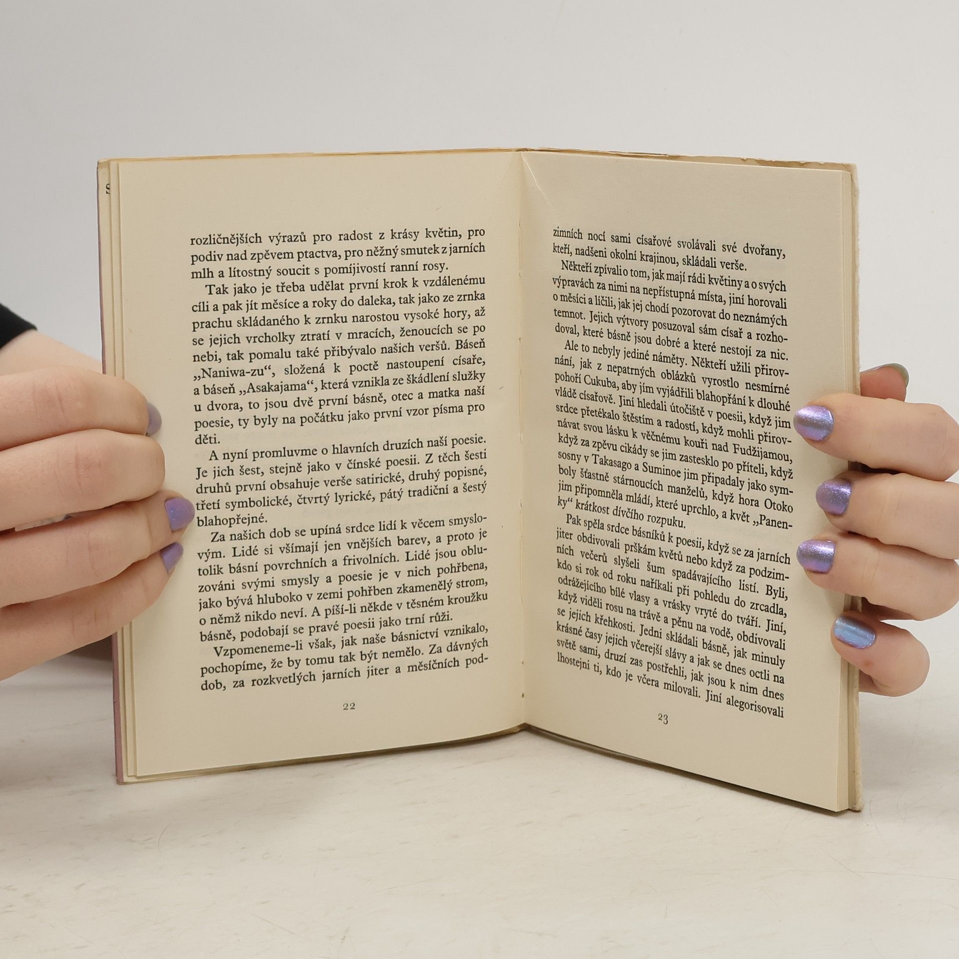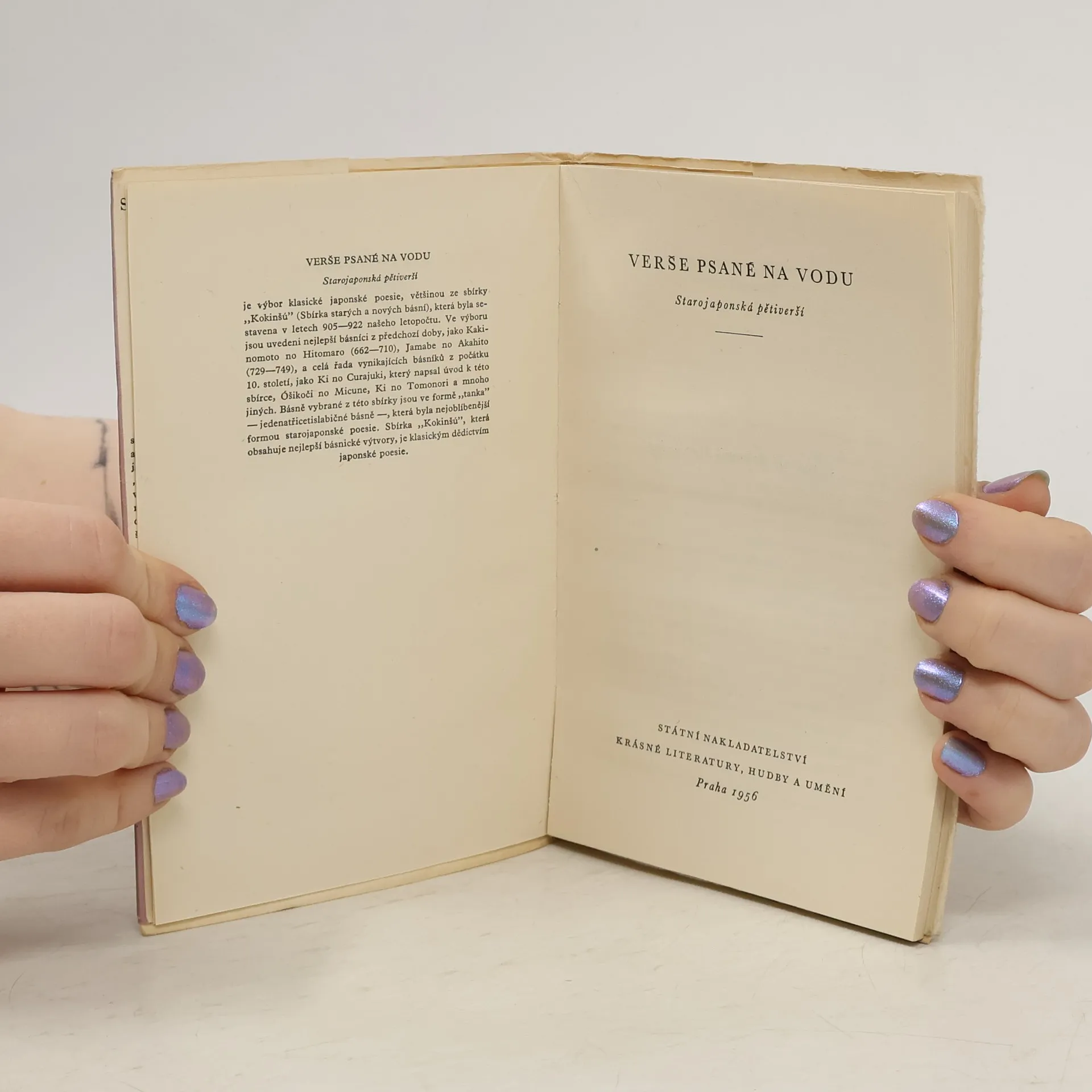 V antologii ze starojaponských básnických sbírek Kokinšú (asi 10. stol.), z níž je vybrána většina básní, a "Manjóšú" (přibližně 2. pol. 8. stol.) je zahrnuto na 50 pětiverší, opěvujících krásu květin i žen, marnou lásku, smutek stárnutí a loučení i záři luny. Na rozdíl od originálu jsou básně rýmovány. Úvod básníka Ki no Curajuki, jednoho z pořadatelů sbírky Kokinšú, nás poučuje o jejím vzniku.